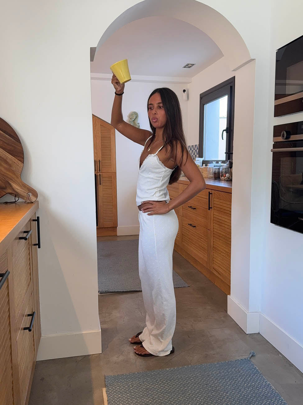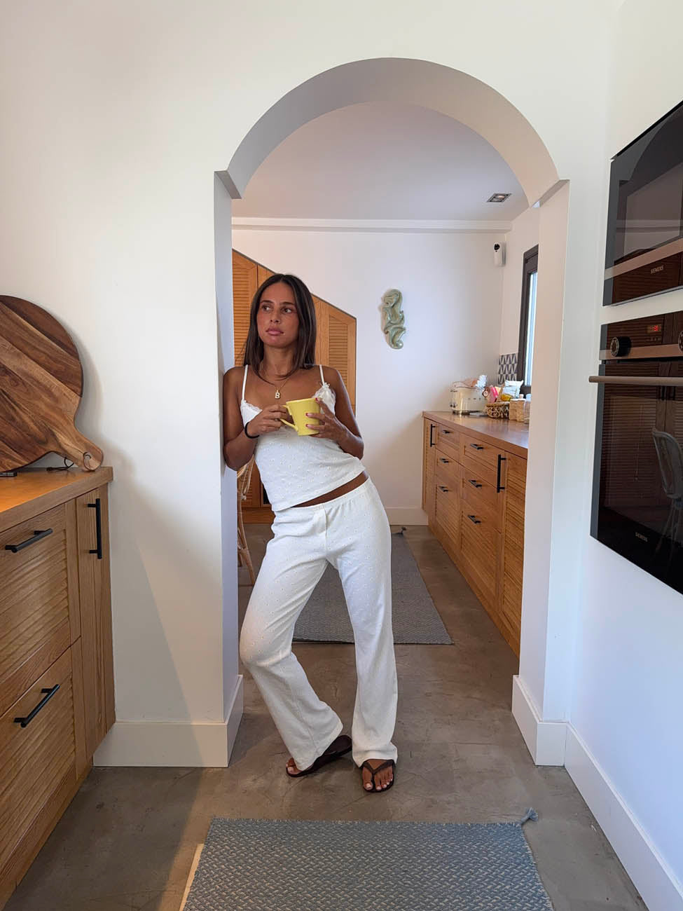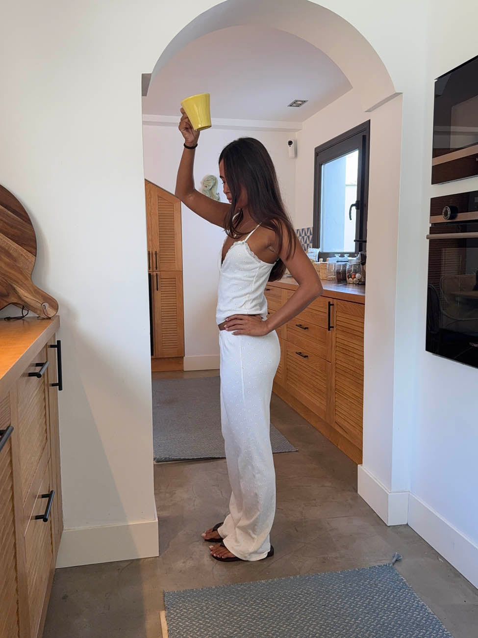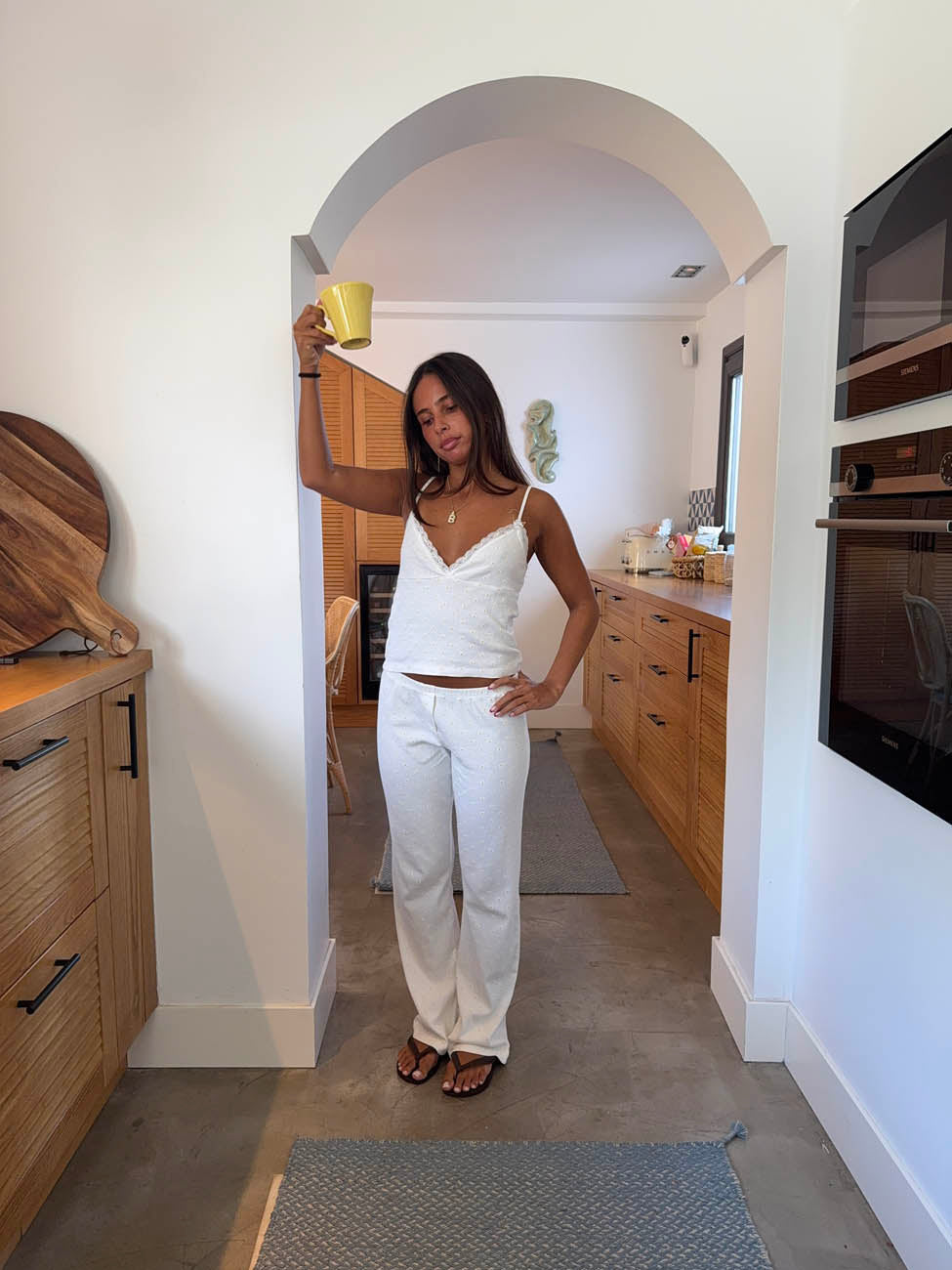 These white trousers with small yellow flowers combine a relaxed fit with a fresh and feminine expression. The soft cotton fabric and elastic waistband ensure maximum comfort, while the simple floral pattern adds a touch of summery charm. Perfect as casual loungewear, for a relaxed day out, or as part of a cozy set with the matching top or shorts.