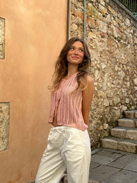 This top is made of a knitted material and is absolutely perfect for summer. It can be worn either as the main part of an outfit or over your outfit as an extra layer. It ties in the front.