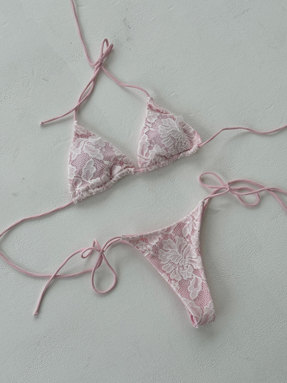 Our pink Amara bikini with white lace consists of a triangle top which is tied at the back and neck. The bikini bottom can also be tied on each side and is therefore adjustable.
