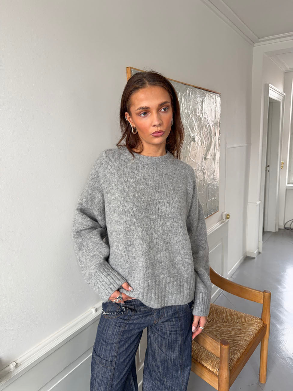 A soft and chunky knit sweater in classic grey. It features a loose, boxy fit with ribbed edges at the hem, cuffs, and neckline, giving it a relaxed and comfortable silhouette. The fluffy texture and timeless color make it a go-to piece throughout the season.