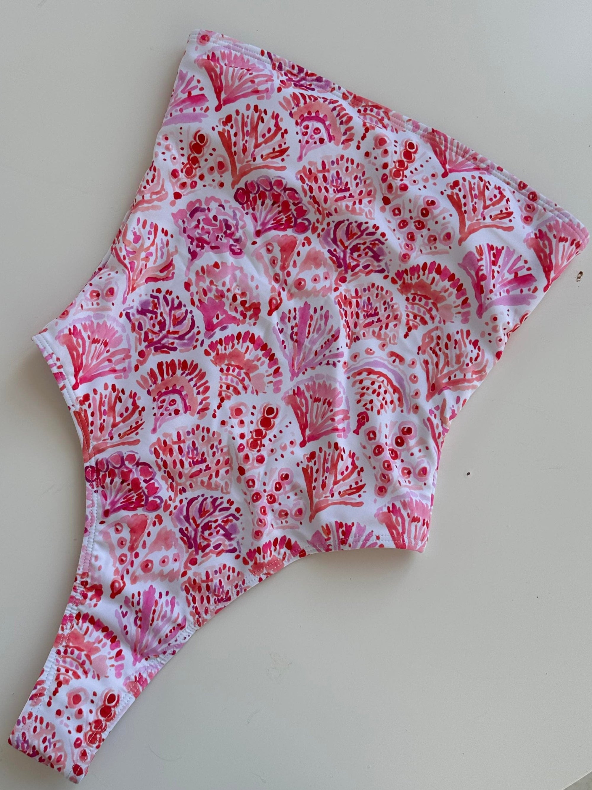 Our Galina strapless swimsuit - white with pink pattern is the perfect swimsuit for summer. The swimsuit has a clam pattern with different colors of pink.
