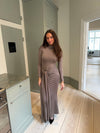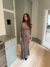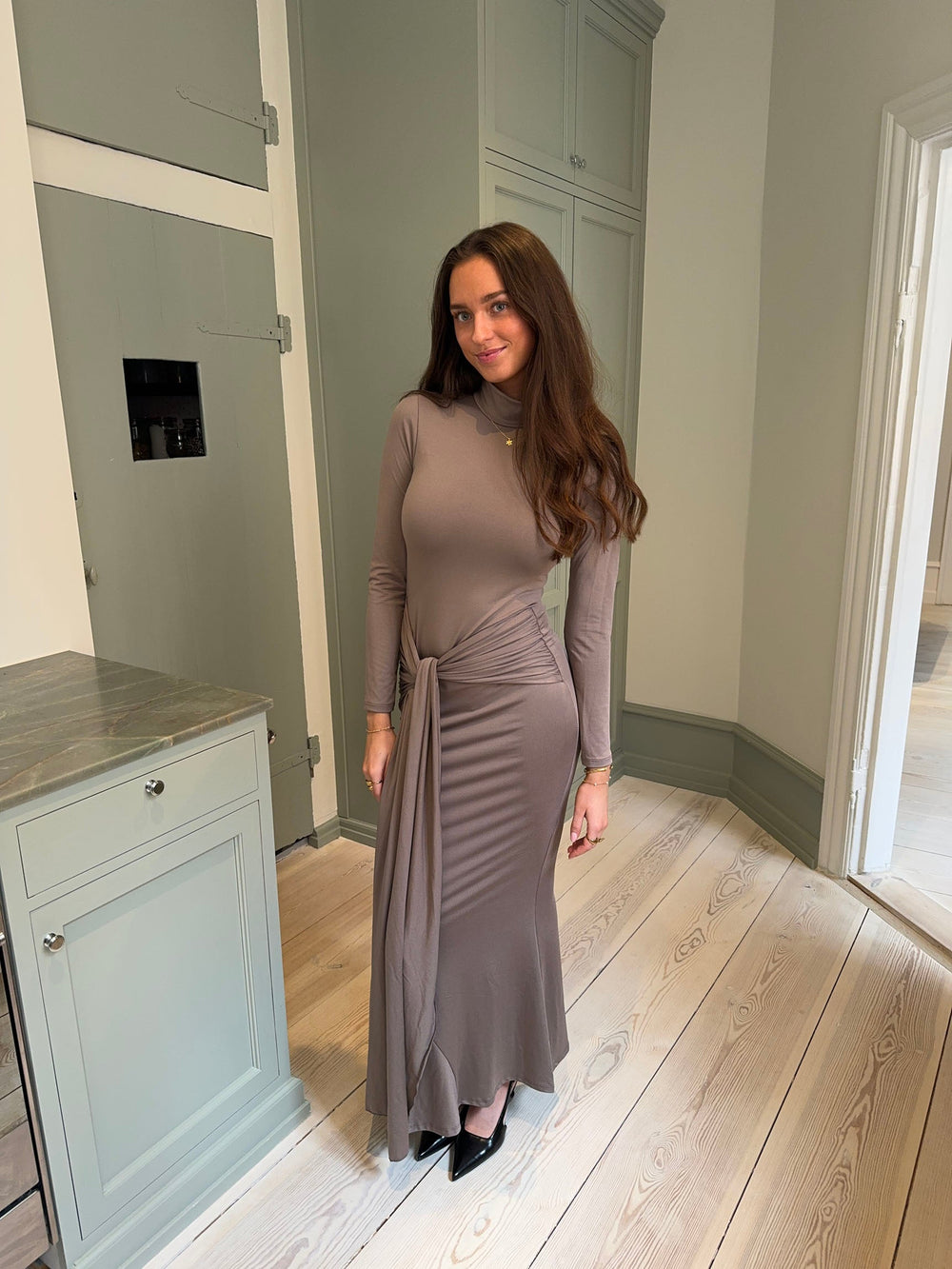 An elegant and stylish maxi dress in a beautiful taupe color. The dress features long sleeves and a sophisticated high neck, creating a classic and refined look. The tie belt at the waist or hips accentuates the figure and adds a feminine silhouette. The flowing fabric falls gracefully along the body, making it perfect for both formal and festive occasions.