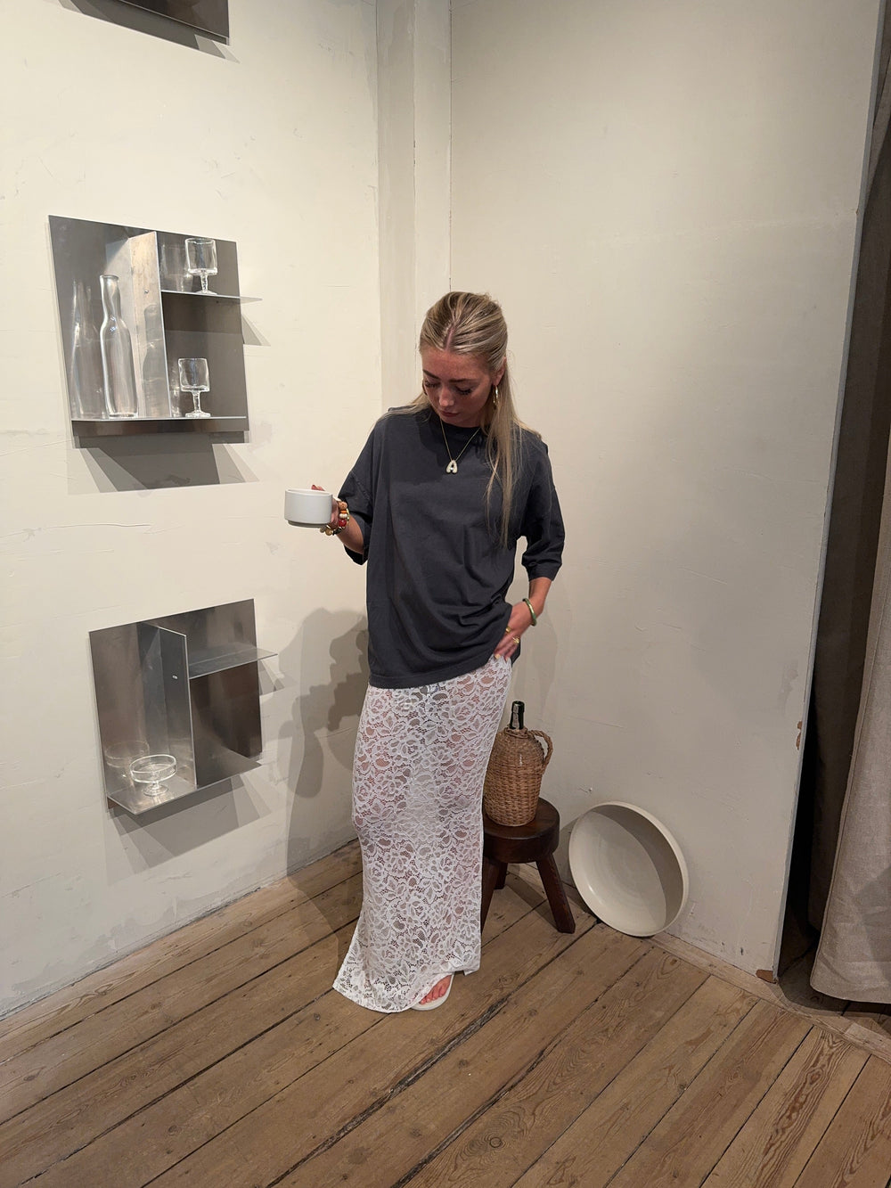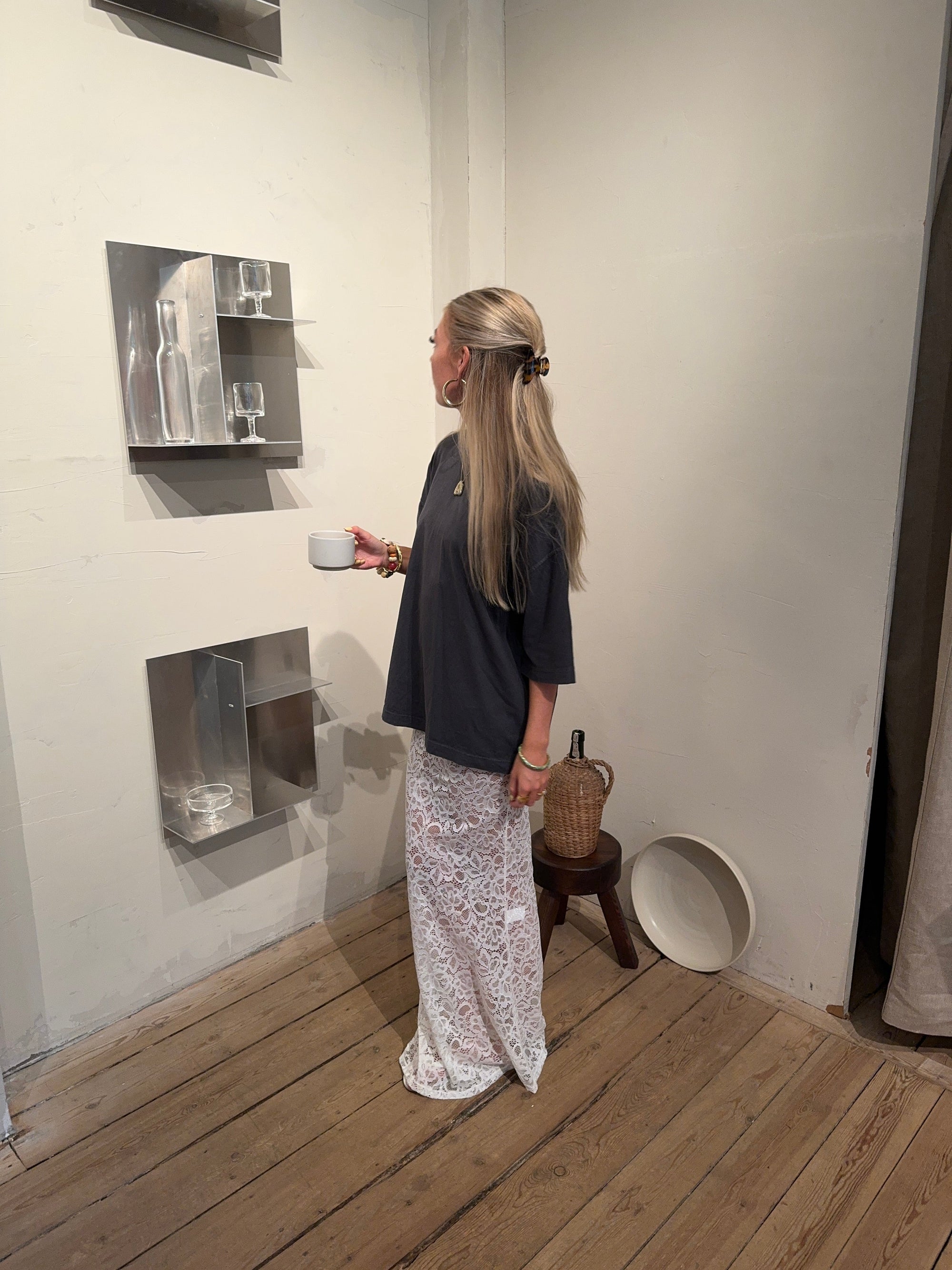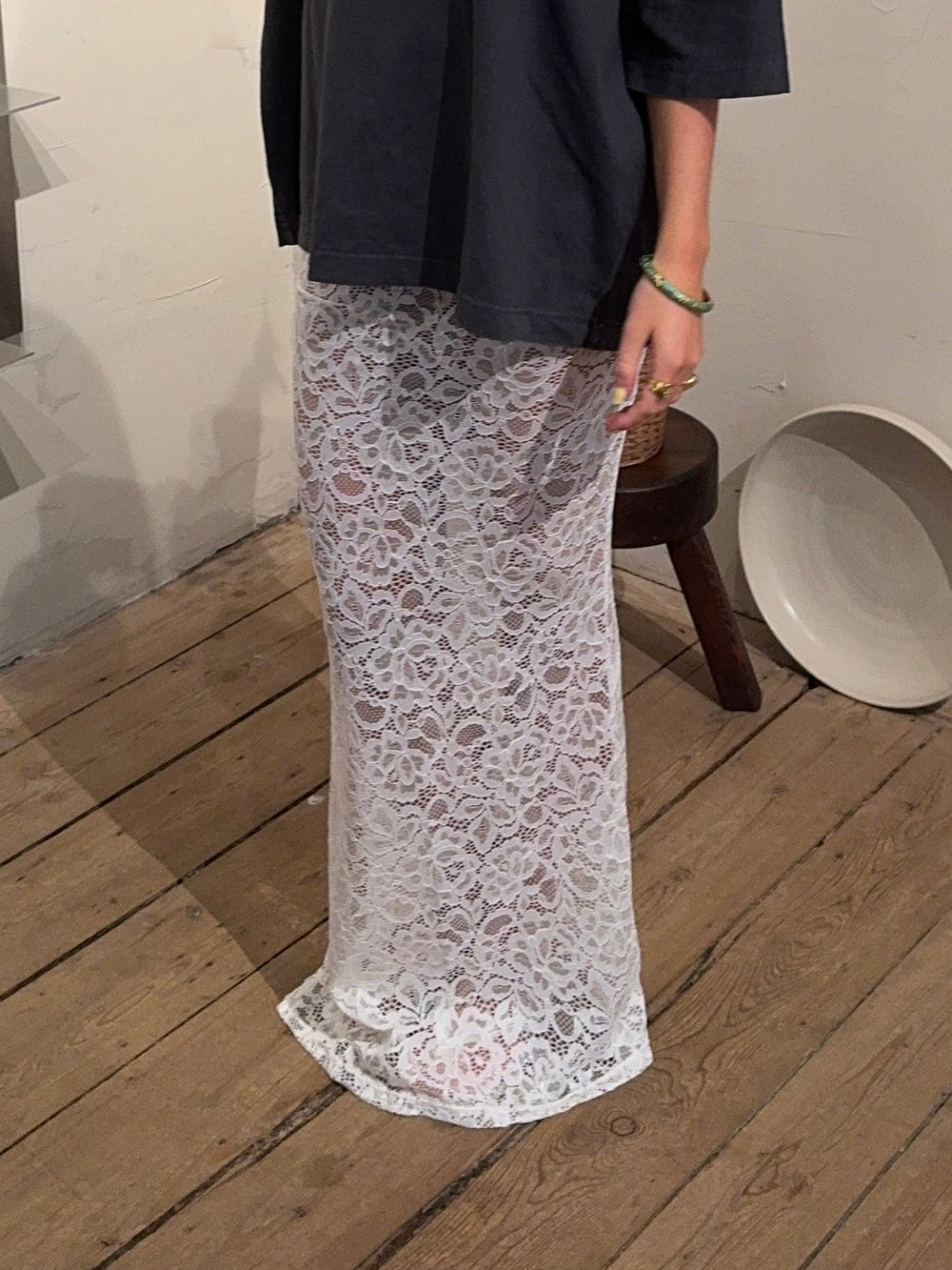 Add a touch of elegance to your wardrobe with this beautiful white lace maxi skirt. The skirt features a straight fit that gives a classic and stylish look, while the lightweight lace material adds a sophisticated touch. The decorative slit on one side offers a subtle yet modern twist, making the skirt perfect for both formal occasions and relaxed summer days. The white color is timeless and versatile, making it easy to style with different tops and accessories for a complete look. However, we’ve chosen to style it with an oversized t-shirt for the ultimate "it girl" look!
