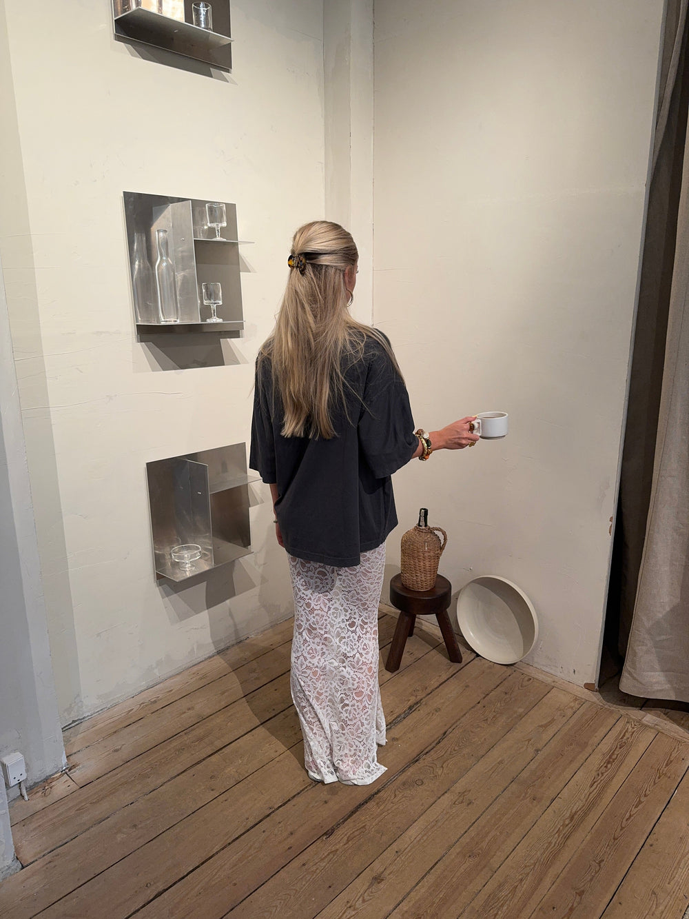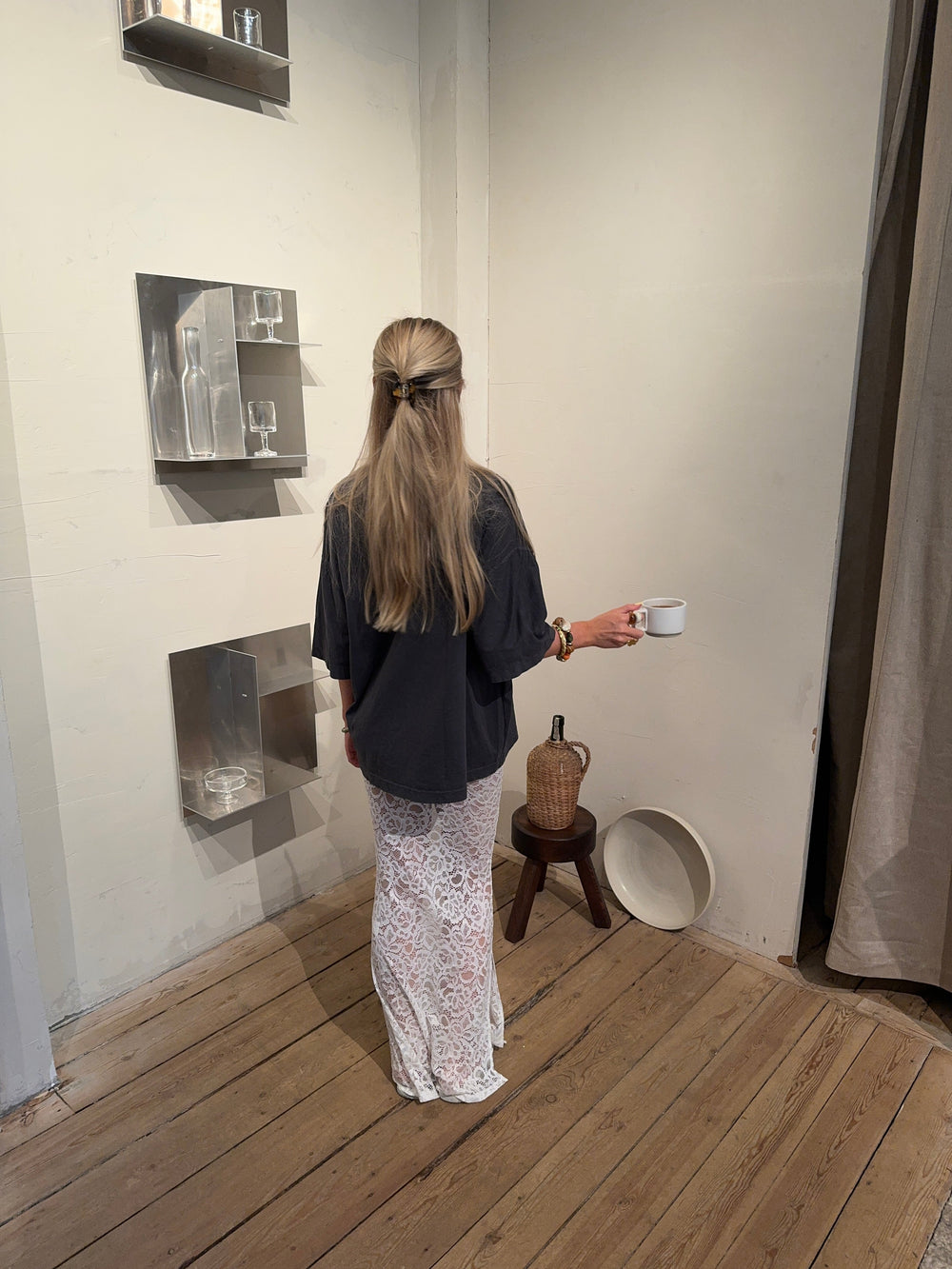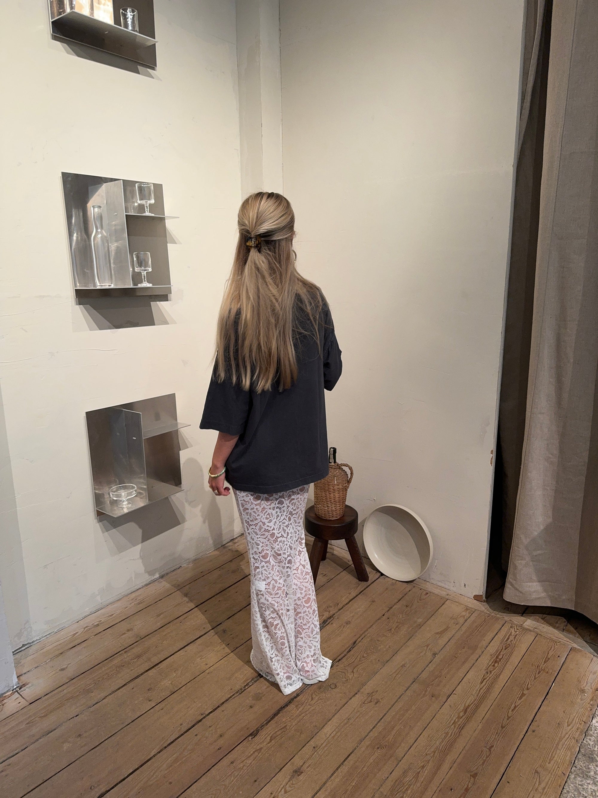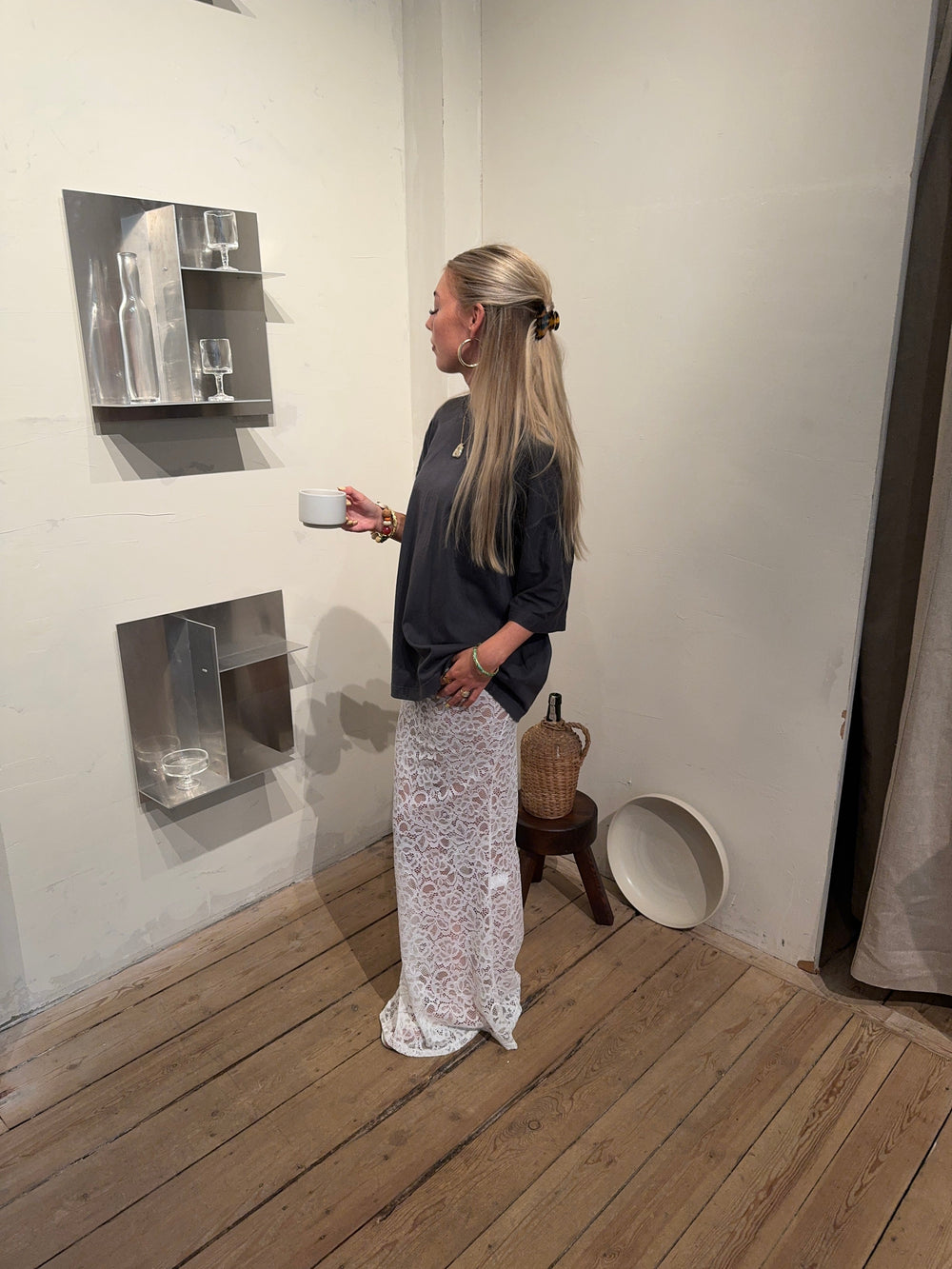 Add a touch of elegance to your wardrobe with this beautiful white lace maxi skirt. The skirt features a straight fit that gives a classic and stylish look, while the lightweight lace material adds a sophisticated touch. The decorative slit on one side offers a subtle yet modern twist, making the skirt perfect for both formal occasions and relaxed summer days. The white color is timeless and versatile, making it easy to style with different tops and accessories for a complete look. However, we’ve chosen to style it with an oversized t-shirt for the ultimate "it girl" look!