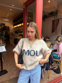 Three-quarter sleeve sweater with a relaxed and loose fit. The sweater features ribbed edges and the word "AMOUR" written on the front in white lettering.