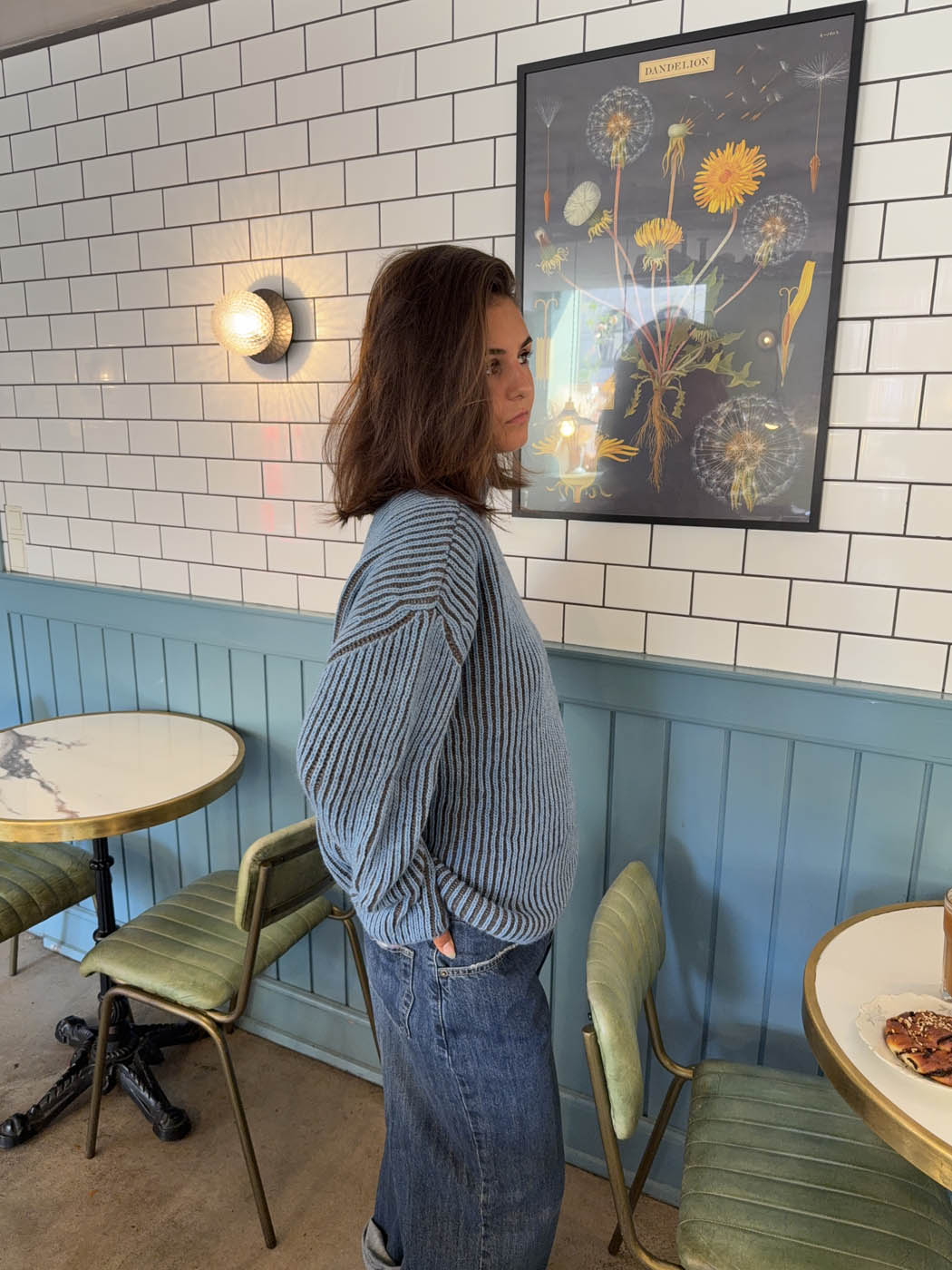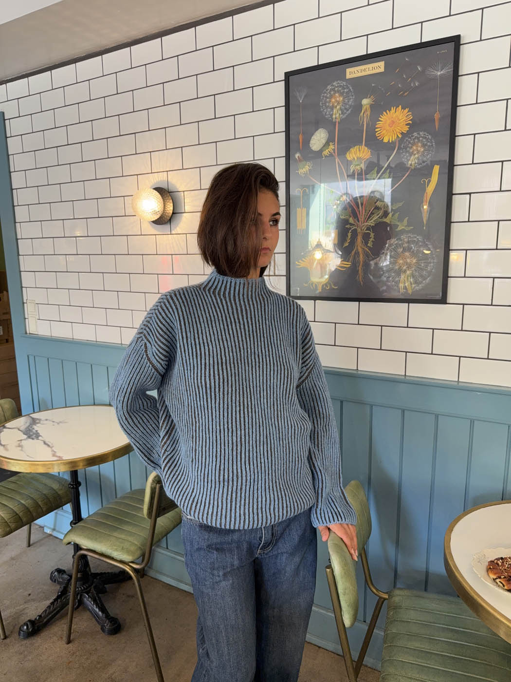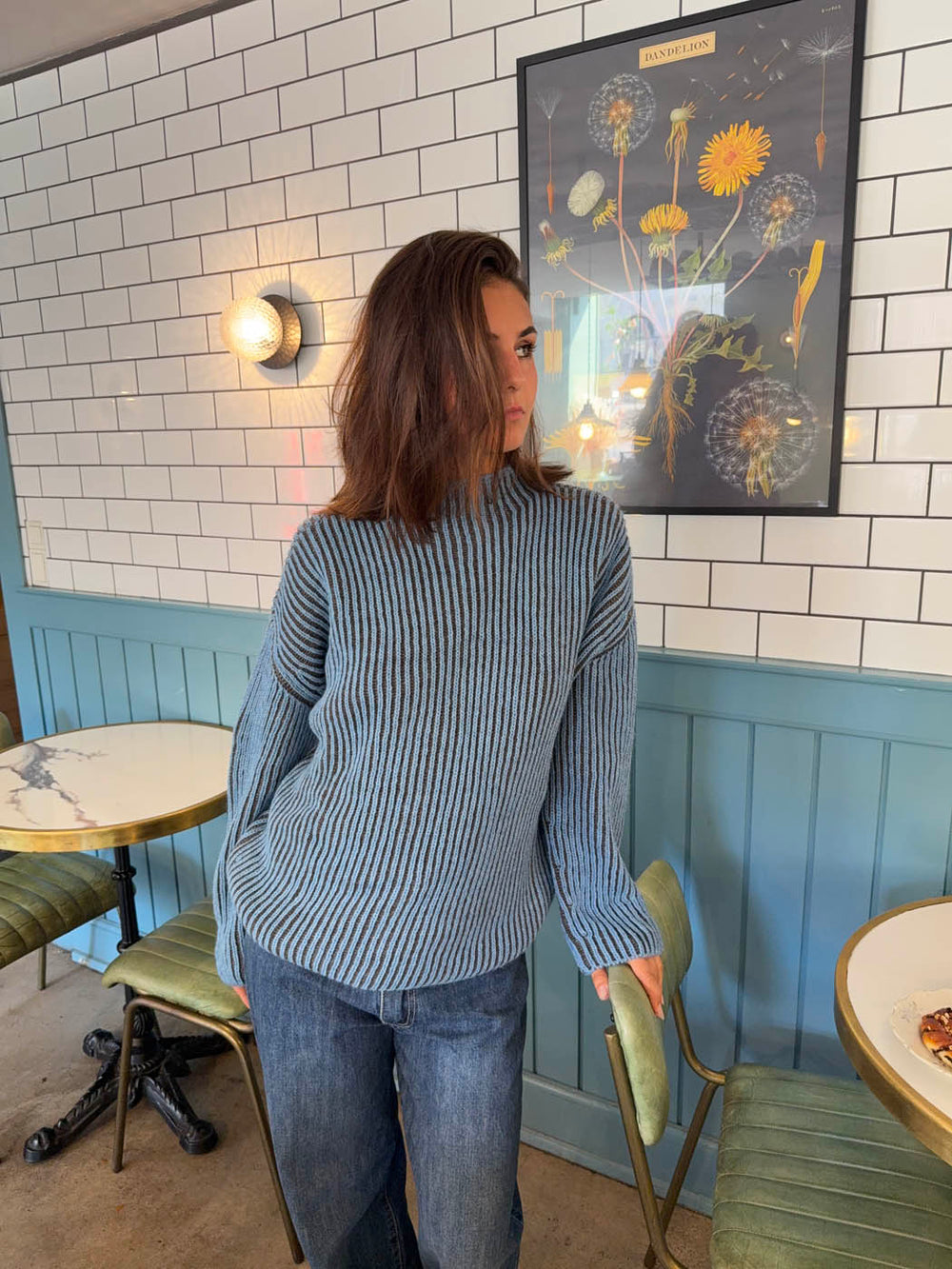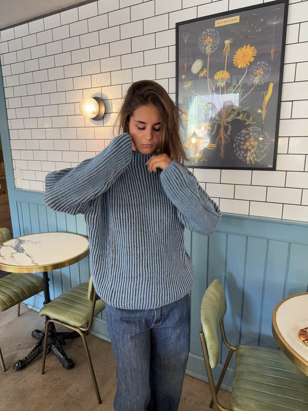 This striped knit sweater features a beautiful combination of blue and brown tones in a bold yet soft contrast, radiating personality and warmth. The vertical ribbed texture subtly enhances the body’s shape without being tight-fitting, while the high collar adds a casual yet stylish touch. Perfect as a transitional piece for cooler days, this sweater can easily be dressed up or down – pair it with jeans for a relaxed look or layer it over a dress for a more feminine styling. The colorful design adds character, while the soft quality ensures all-day comfort.