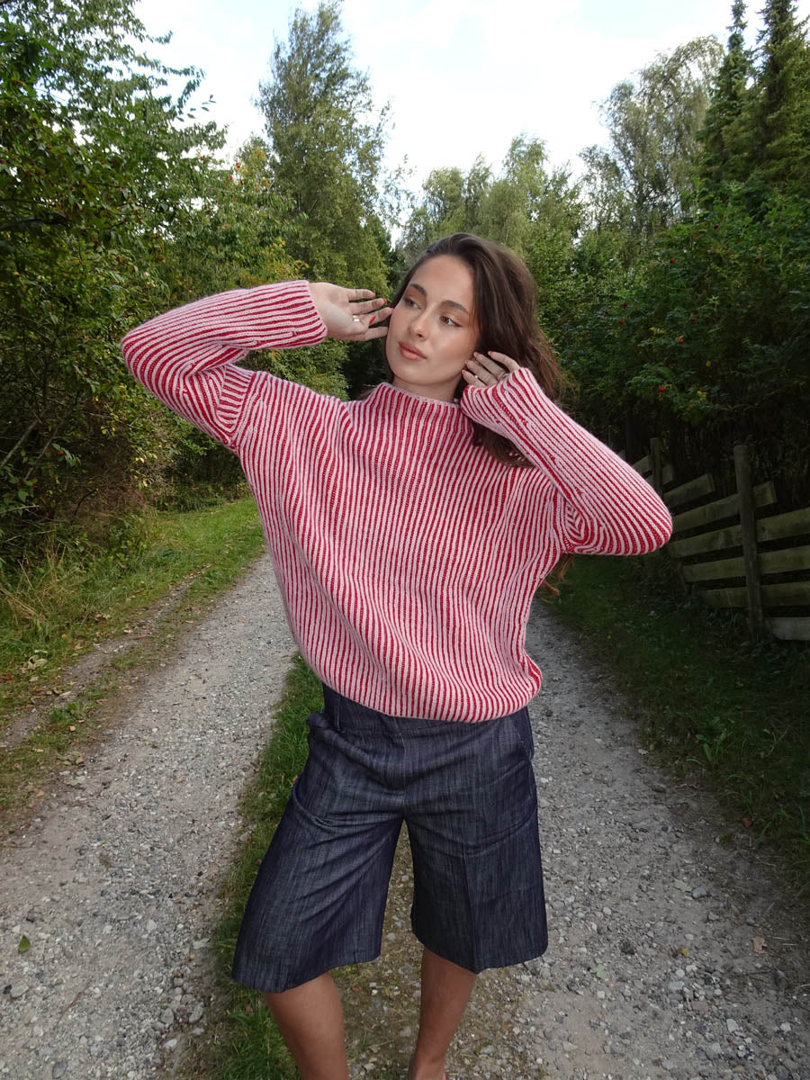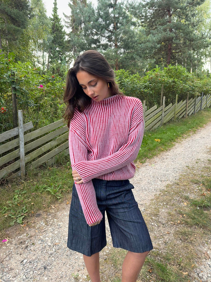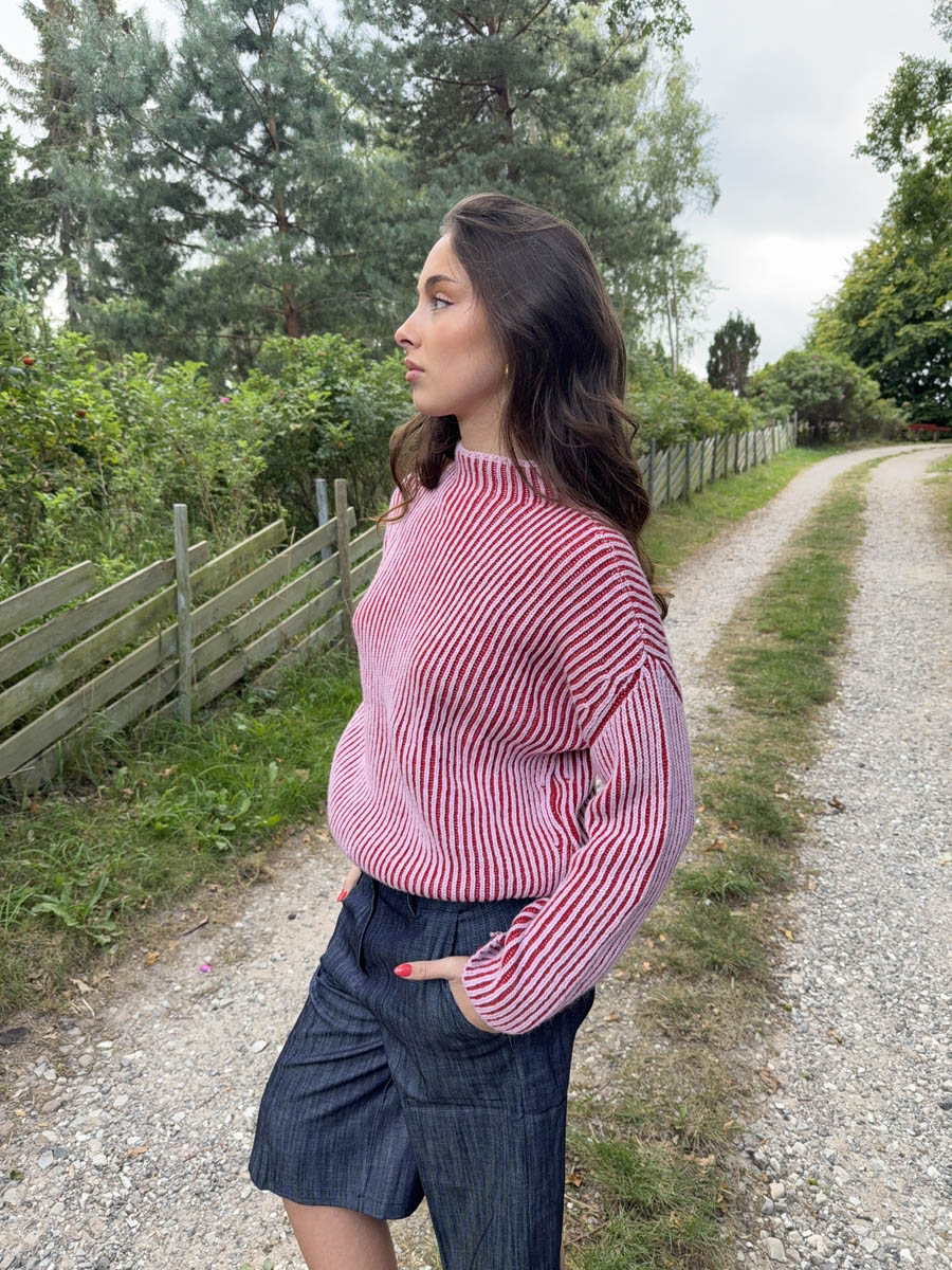 This striped knit sweater combines red and pink in a bold yet soft contrast that radiates personality and warmth. The vertical ribbed structure flatters the body without being tight-fitting, and the high collar adds a casual yet stylish touch. It's the perfect transitional piece for cooler days and can easily be dressed up or down – with jeans for a laid-back look or layered over a dress for a more feminine styling. The vibrant color combination adds character, while the soft fabric ensures all-day comfort.