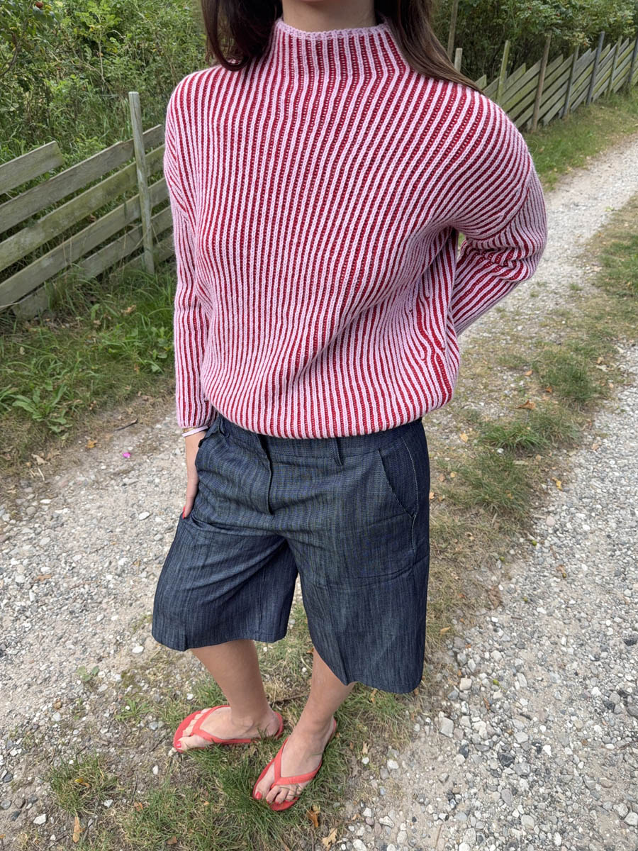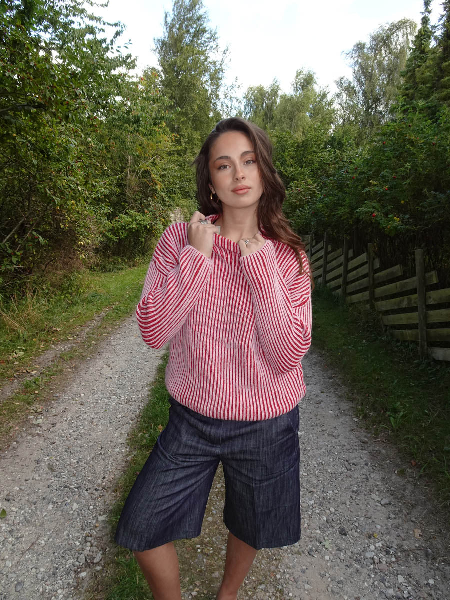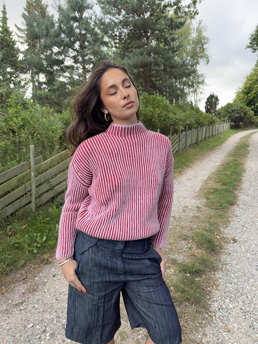This striped knit sweater combines red and pink in a bold yet soft contrast that radiates personality and warmth. The vertical ribbed structure flatters the body without being tight-fitting, and the high collar adds a casual yet stylish touch. It's the perfect transitional piece for cooler days and can easily be dressed up or down – with jeans for a laid-back look or layered over a dress for a more feminine styling. The vibrant color combination adds character, while the soft fabric ensures all-day comfort.
