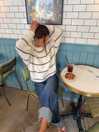 A soft and cozy knitted sweater in a brown melange color with decorative horizontal stripes. The sweater features a relaxed fit with wide sleeves and ribbed edges at the neckline, cuffs, and hem for a comfortable fit. Perfect for cold days when comfort and style go hand in hand.
