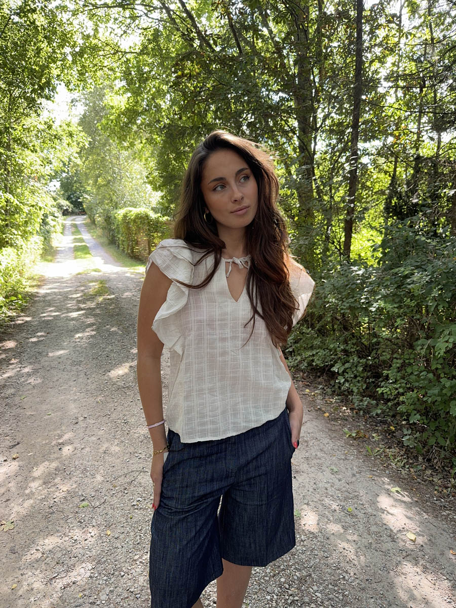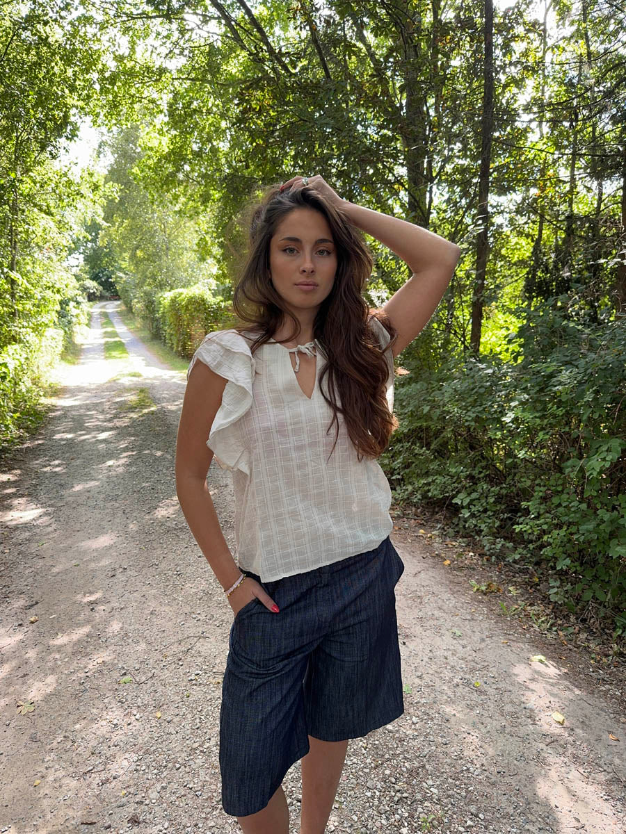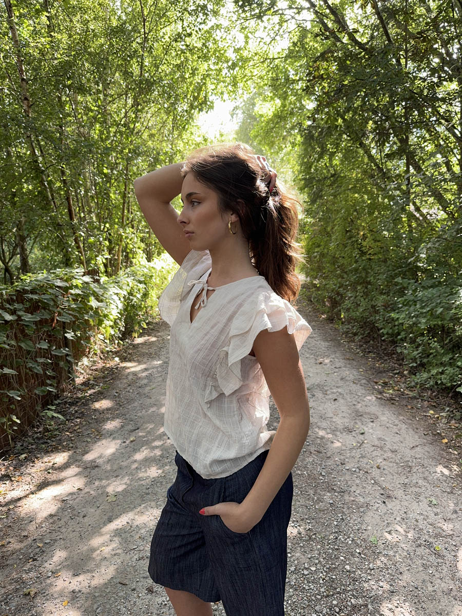 This airy top in soft woven cotton offers a feminine and natural look with a subtle touch of romance. The delicate texture of the fabric, combined with voluminous ruffle sleeves and a tie at the neckline, creates a relaxed yet refined expression. Perfect for warm days or as a light layering piece under a blazer or knit. Its neutral tone makes it easy to style with everything from jeans and shorts to skirts in contrasting colors or calm, earthy tones. A versatile piece suitable for both everyday wear and special occasions.