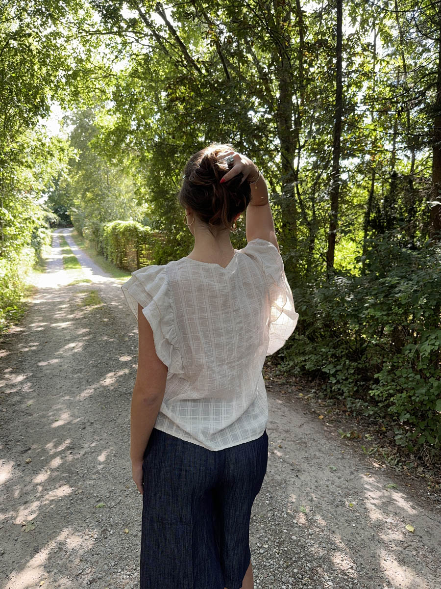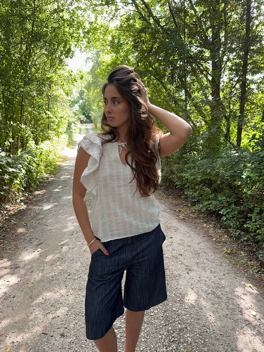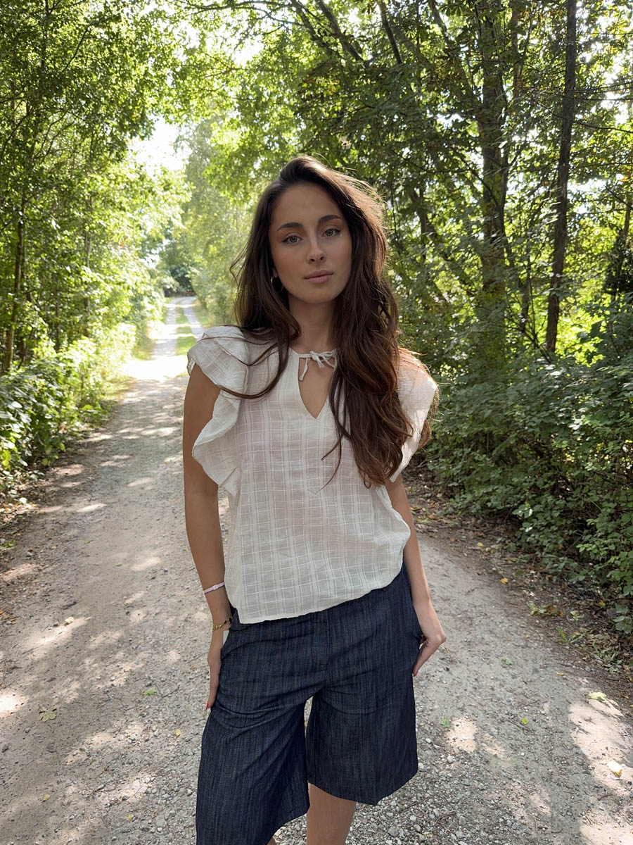 This airy top in soft woven cotton offers a feminine and natural look with a subtle touch of romance. The delicate texture of the fabric, combined with voluminous ruffle sleeves and a tie at the neckline, creates a relaxed yet refined expression. Perfect for warm days or as a light layering piece under a blazer or knit. Its neutral tone makes it easy to style with everything from jeans and shorts to skirts in contrasting colors or calm, earthy tones. A versatile piece suitable for both everyday wear and special occasions.