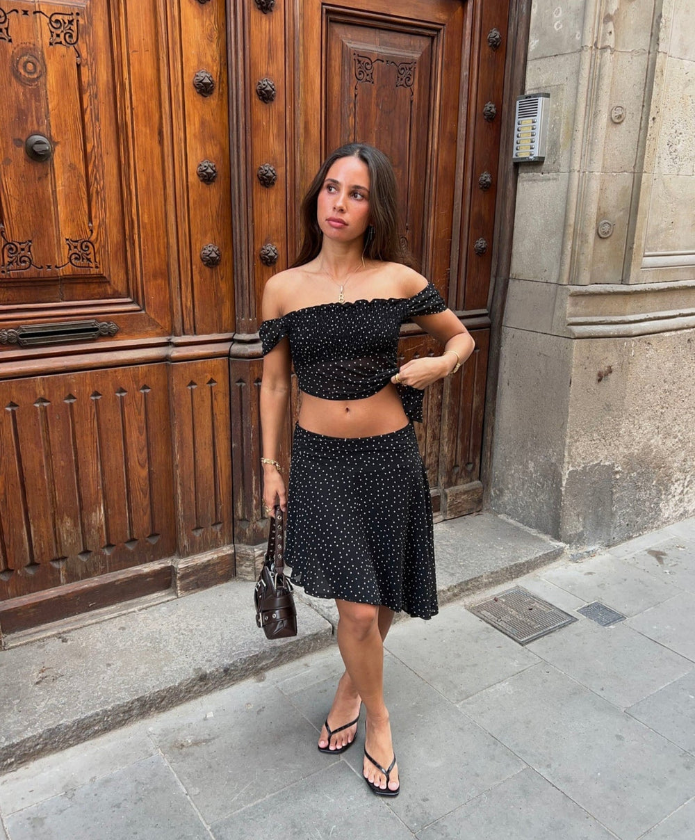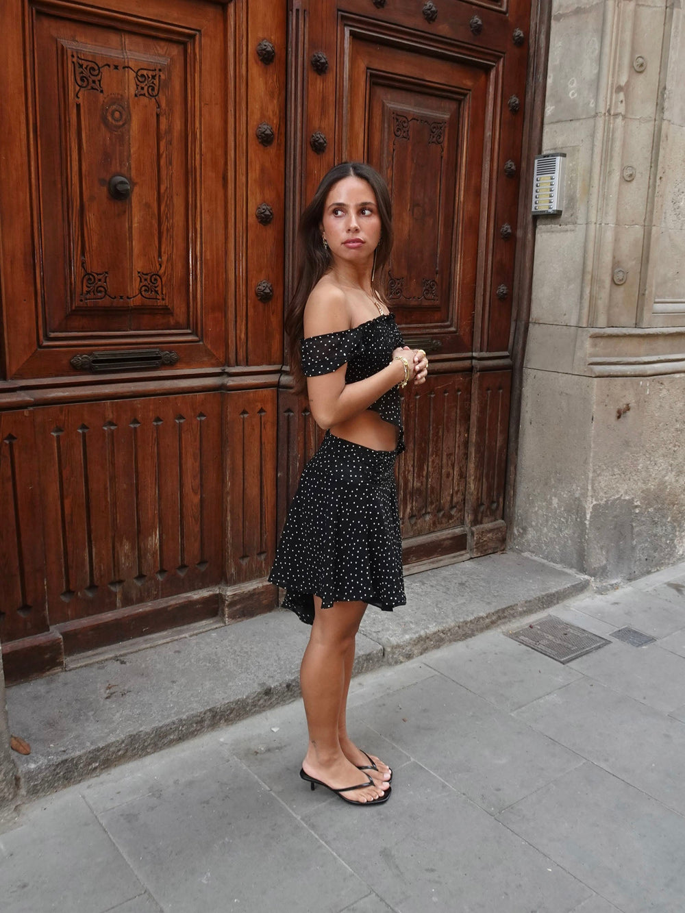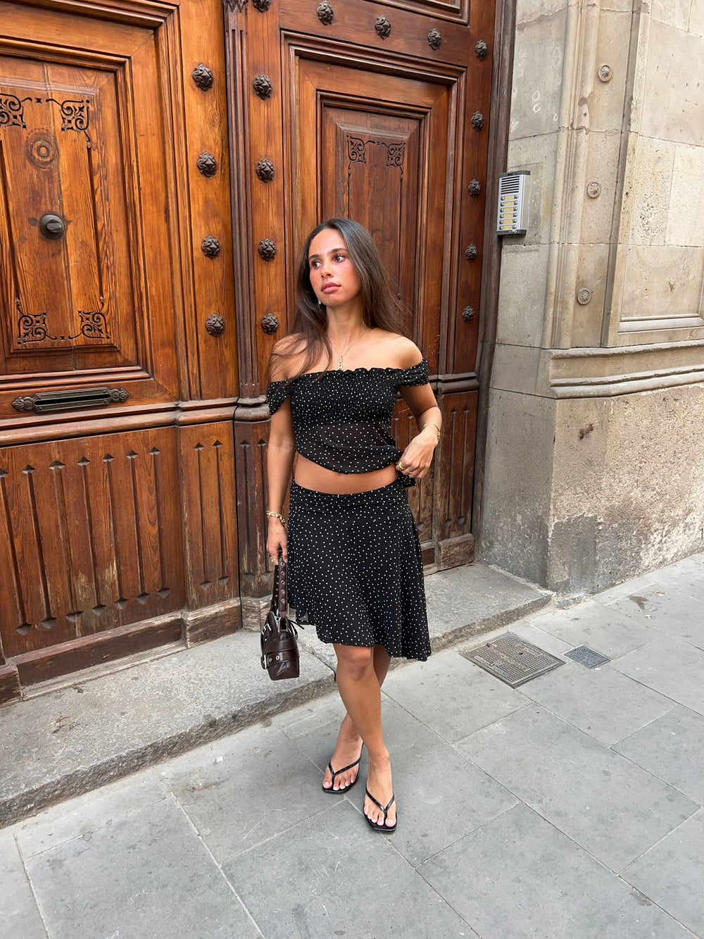 Our asymmetrical polka dot skirt brings playful charm and timeless elegance to your wardrobe. Crafted from a lightweight fabric that flows beautifully in a swaying silhouette, it features a subtle dot pattern that adds a feminine and classic touch. Perfect for everyday styling or festive occasions. Wear it on its own or pair it with Leira, the matching top, for a complete set.