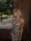 This halterneck top exudes elegance with its striking print and minimalist silhouette. The open back and long tie closure offer a sensual finish, while the semi-sheer fabric creates a light, effortless feel—perfect for both sunny days and chic evening looks. Wear it on its own or pair it with the matching Blancina skirt for a coordinated statement outfit.