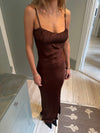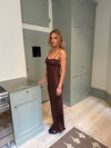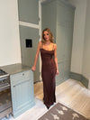 This dress features a beautiful earth-toned brown shade and an elegant, flowing design. Made from a light and shiny fabric, it exudes an exclusive look. The ruched bust and delicate strap details create a feminine silhouette, while the long, loose-fitting skirt with a subtle slit adds a sophisticated touch. Perfect for both formal occasions and stylish evening outings.
