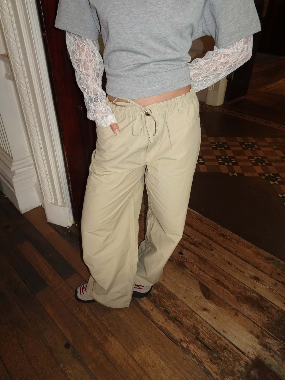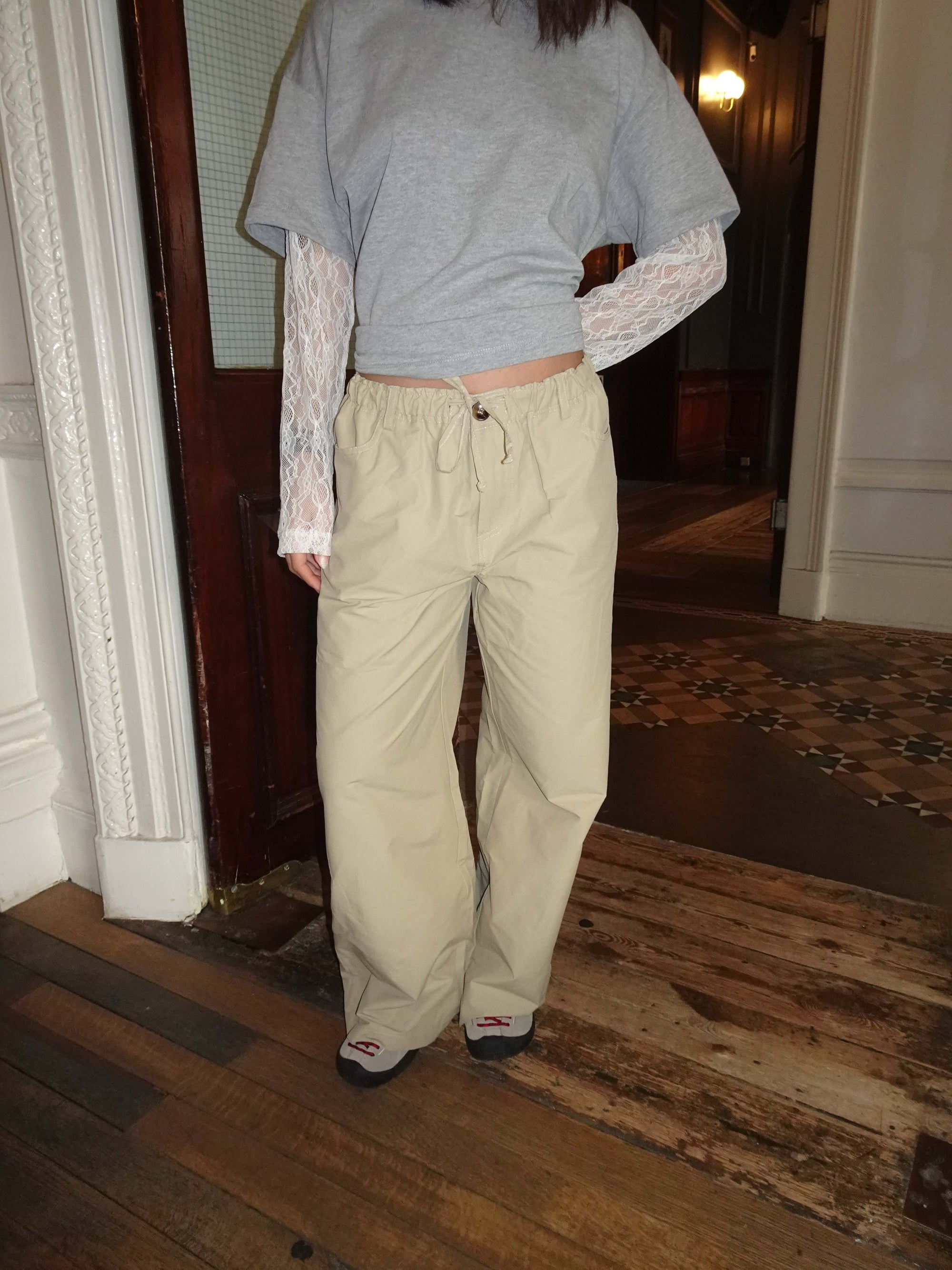 These light cream-beige trousers are designed with comfort and ease in mind. The smooth, breathable fabric feels soft against the skin and drapes gently around the body. The elastic waistband with an adjustable drawstring provides a flexible fit and a relaxed, effortless look. A single button and discreet fly add a classic touch to the otherwise simple design.
