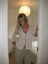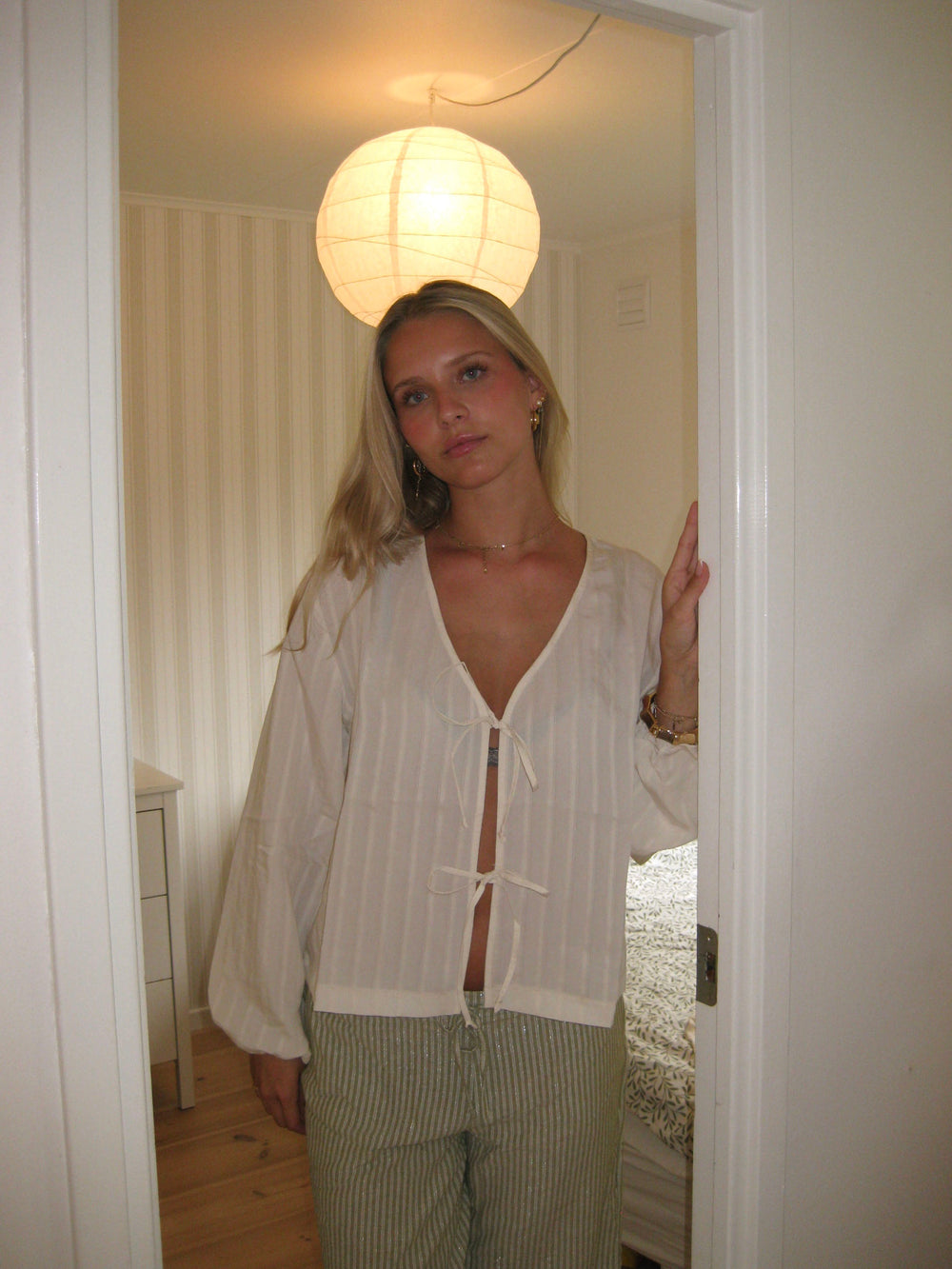 This lightweight tie-front shirt offers a simple yet refined look with delicate front ties and voluminous balloon sleeves finished with elasticated cuffs. The textured cotton-blend fabric adds character, while the open-front design makes it perfect for layering – wear it over tops, dresses, or on its own as a light jacket.