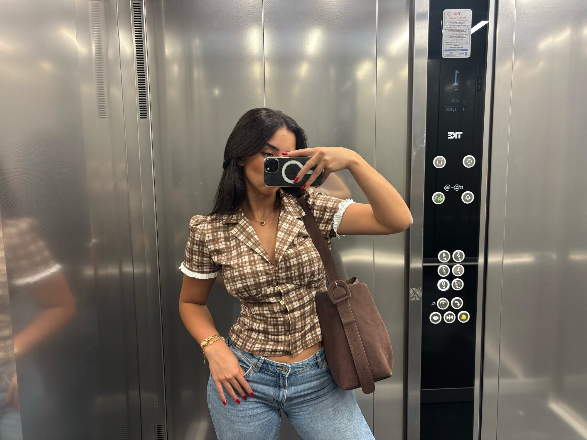 This fitted shirt in a white and brown checkered pattern is a form-fitting piece with a classic plaid design. The shirt has short sleeves and a feminine silhouette that fits closely without feeling tight. Ruffles at the sleeve ends add an extra feminine touch. Made from a lightweight fabric, it feels soft against the skin and is perfect for both everyday wear and more casual, dressy occasions.