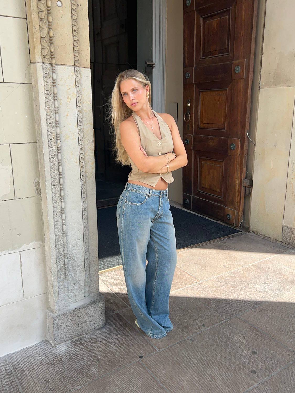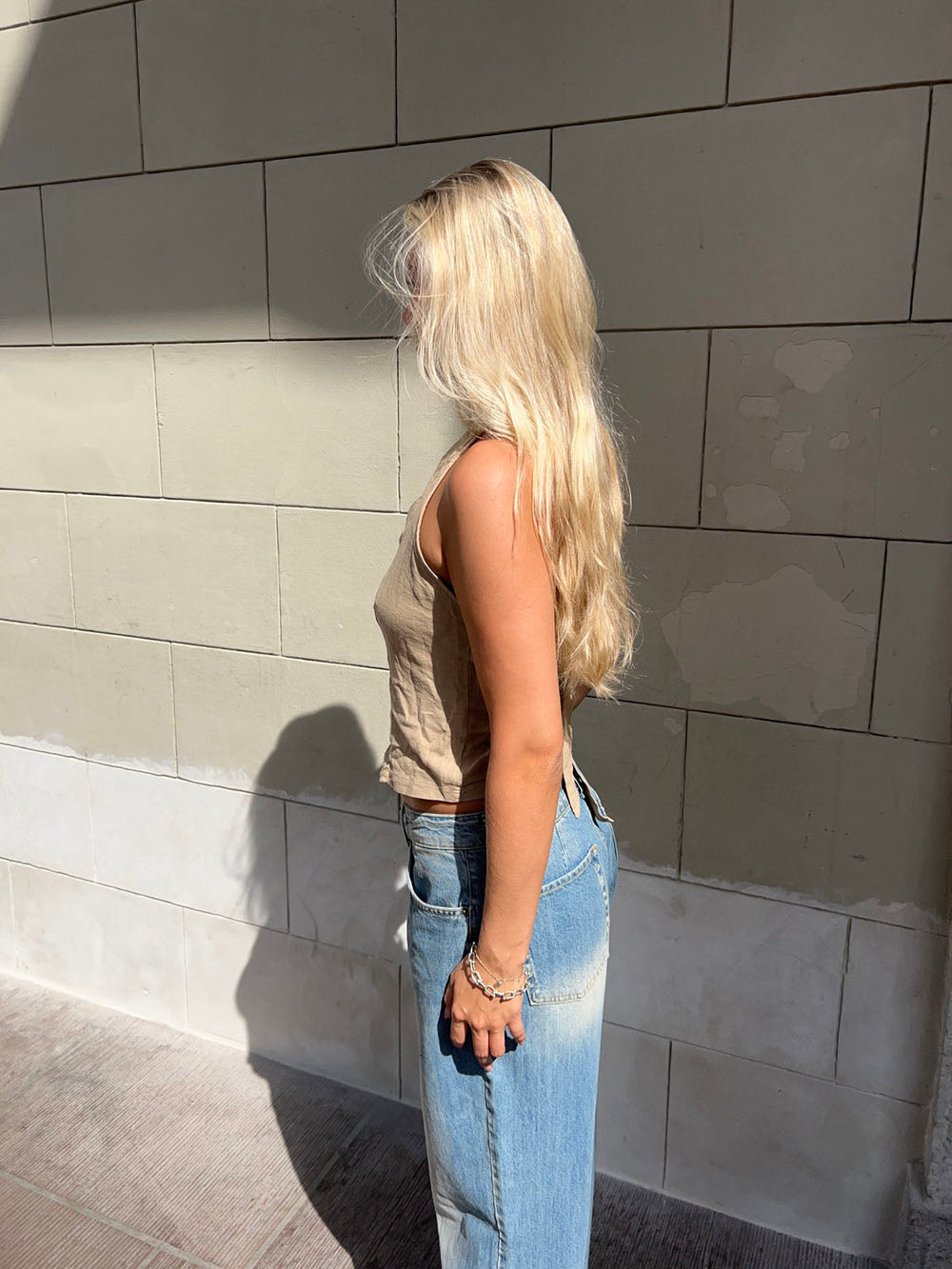 This vest-like halterneck top in dark beige combines a minimalist expression with elegant details. The wide strap design and covered buttons create a refined look, while the open back and elastic band at the neck provide a flattering and flexible fit. The textured fabric adds a subtle tactile dimension, making the top interesting without being overstated.