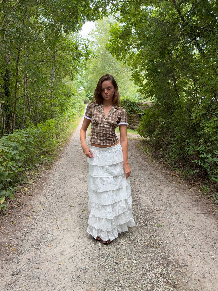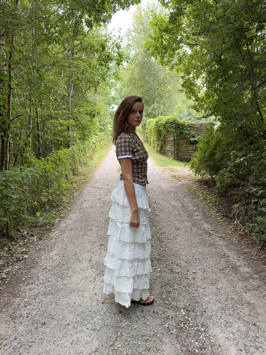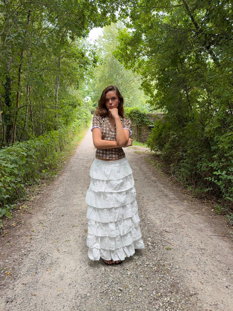This romantic skirt in classic white is crafted from lightweight cotton with broderie anglaise and beautiful layered ruffles. The intricate cut-out embroidery adds a feminine and airy touch, while the voluminous ruffles create movement and fullness. The fit is comfortable with an elastic waistband, offering both flexibility and a flattering silhouette.