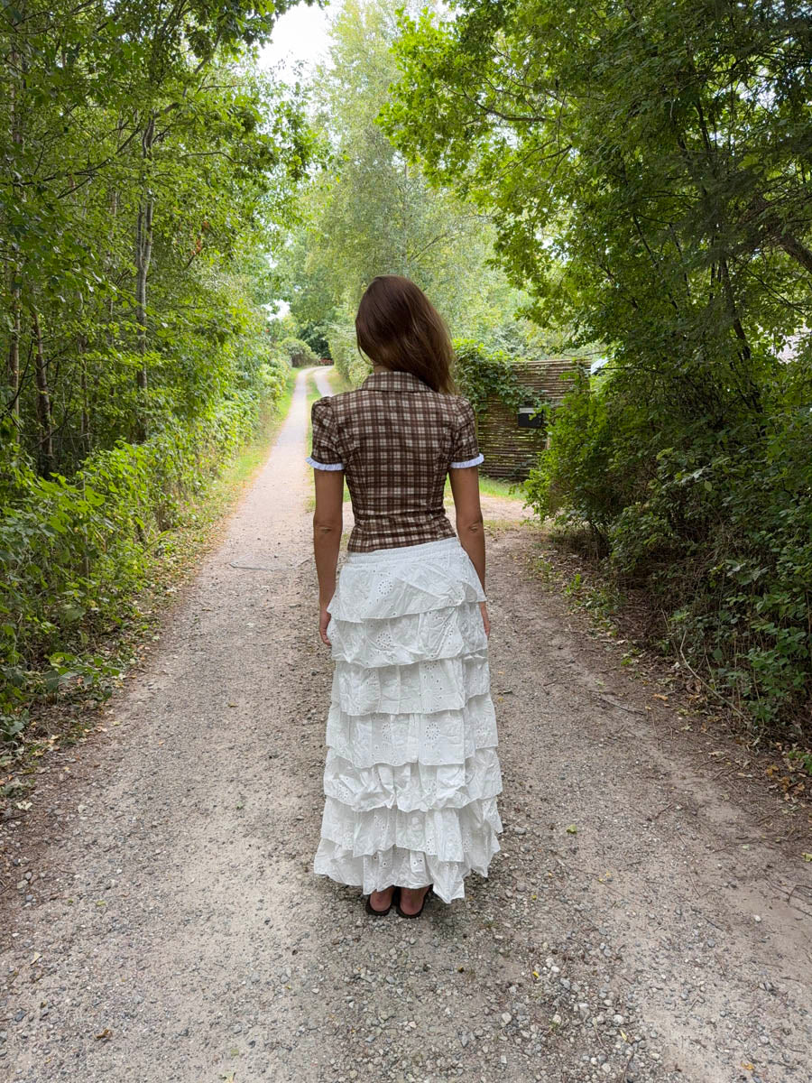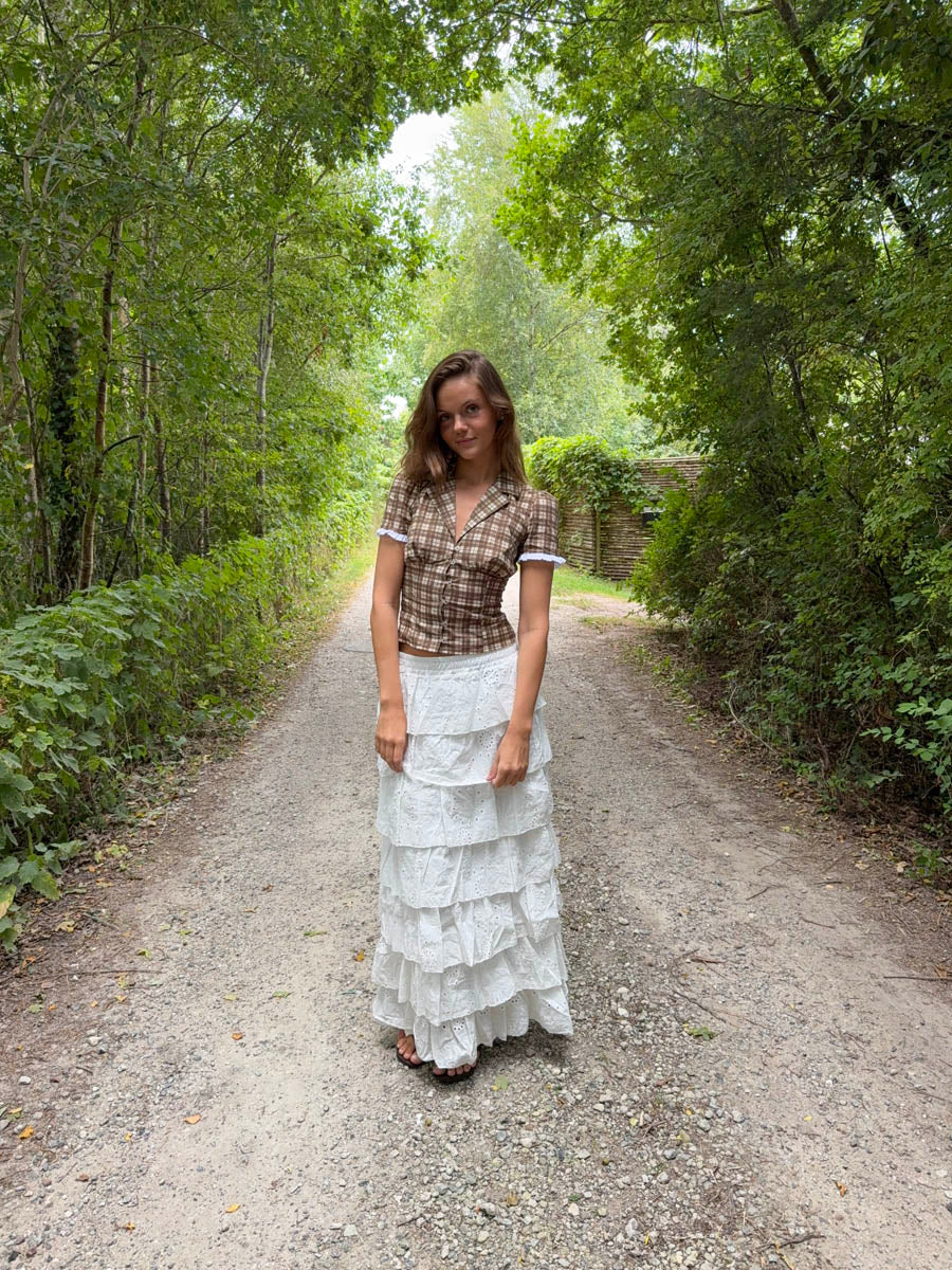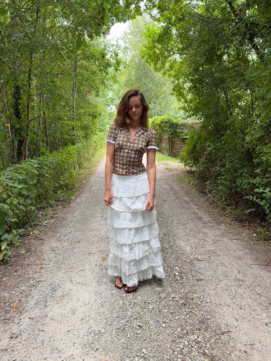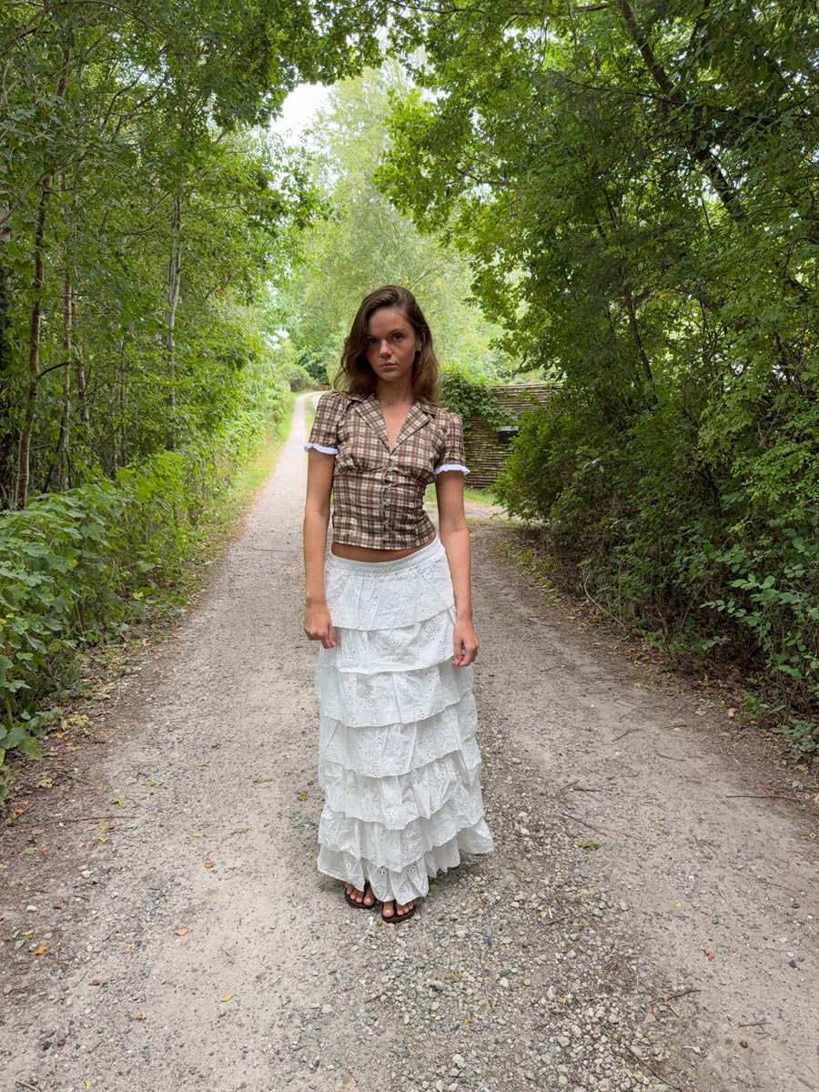 This romantic skirt in classic white is crafted from lightweight cotton with broderie anglaise and beautiful layered ruffles. The intricate cut-out embroidery adds a feminine and airy touch, while the voluminous ruffles create movement and fullness. The fit is comfortable with an elastic waistband, offering both flexibility and a flattering silhouette.