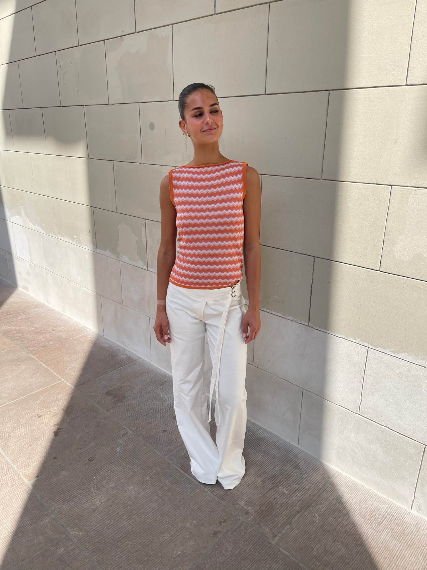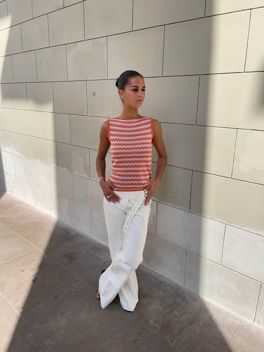 This colorful knit top is designed with an eye-catching zigzag pattern in shades of orange, pink, and white, giving it a playful and retro-inspired look. The fitted, sleeveless silhouette is paired with a soft, lightweight knit texture, making the top comfortable and breathable – ideal for warm summer days.