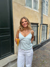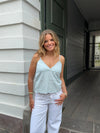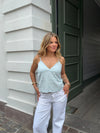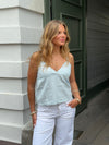The fine embroidered details along the edges add a romantic, handcrafted touch, while the subtly defined seam under the bust creates a flattering silhouette. The top features thin spaghetti straps that emphasize the light and summery feel, making it ideal for hot weather.