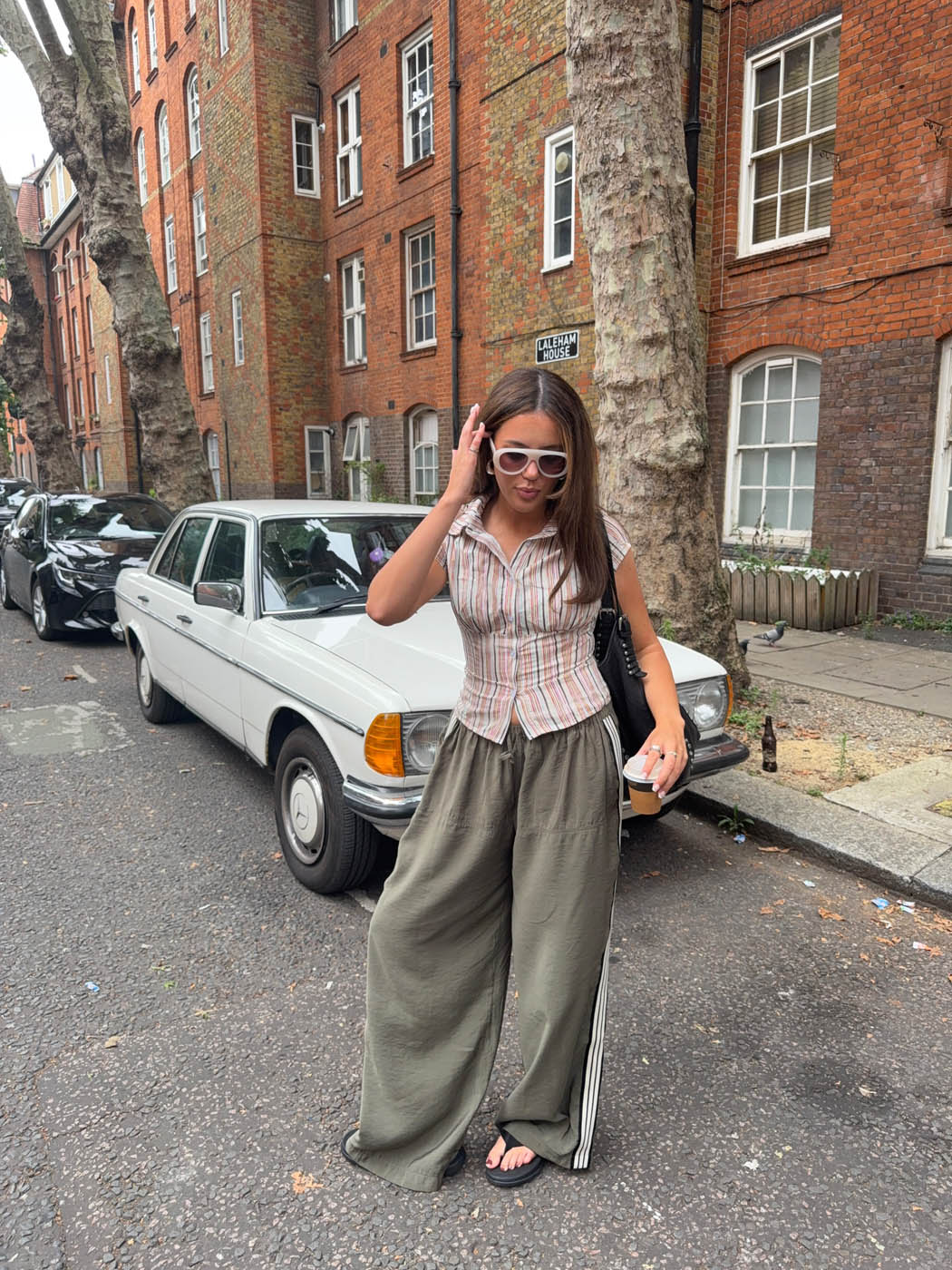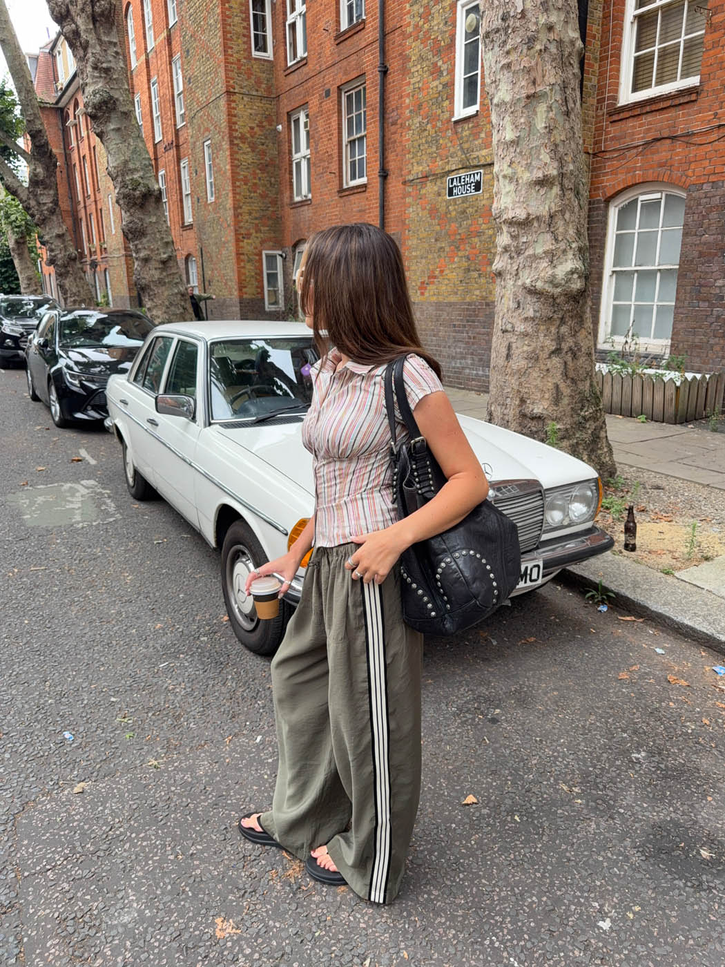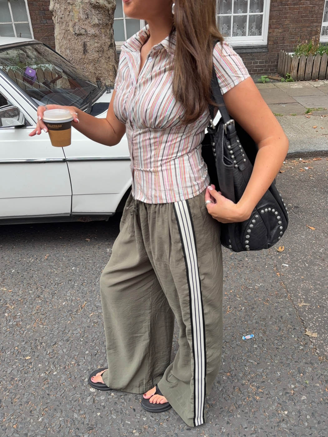 These loose-fitting khaki pants blend sporty details with laid-back comfort. The lightweight fabric and elastic waistband make them ideal for everyday wear, while the black and white side stripes add a modern, athleisure-inspired twist. A versatile choice for relaxed days or casual outings with a stylish edge.