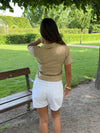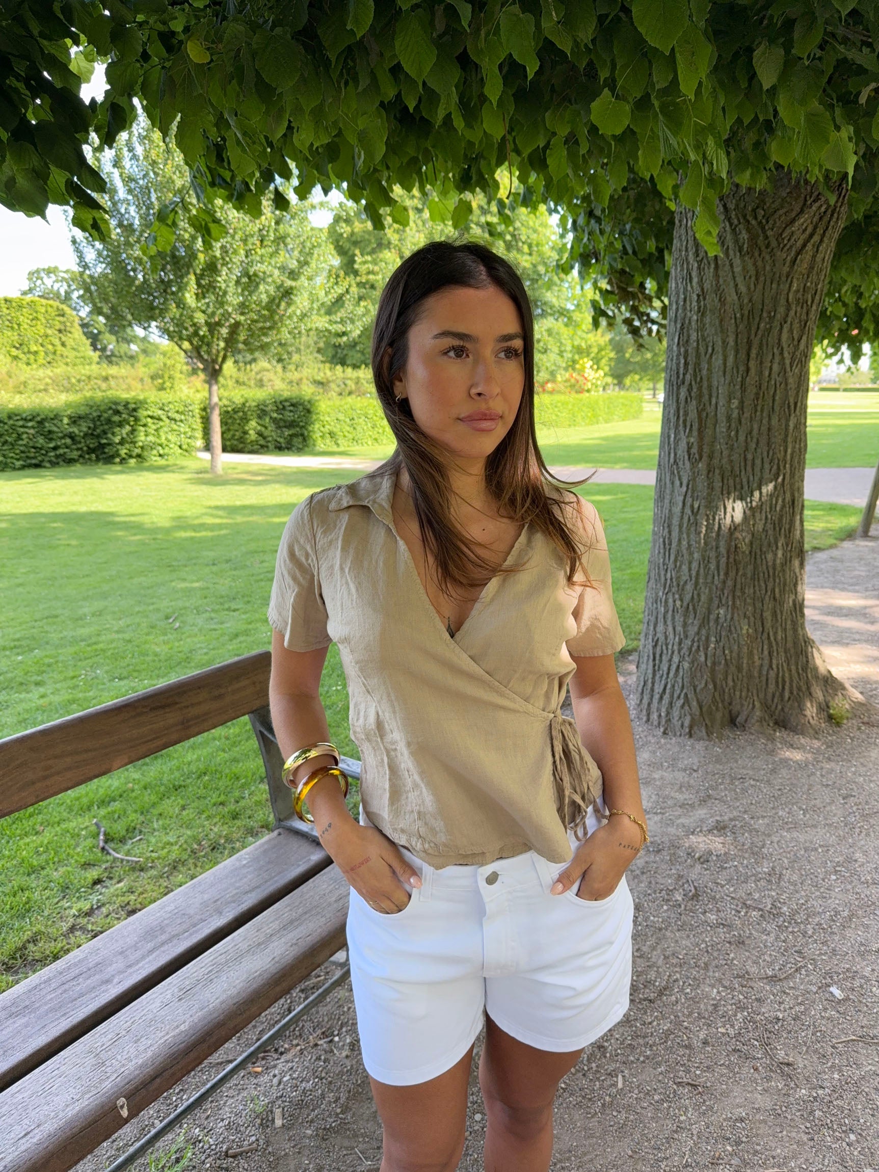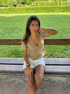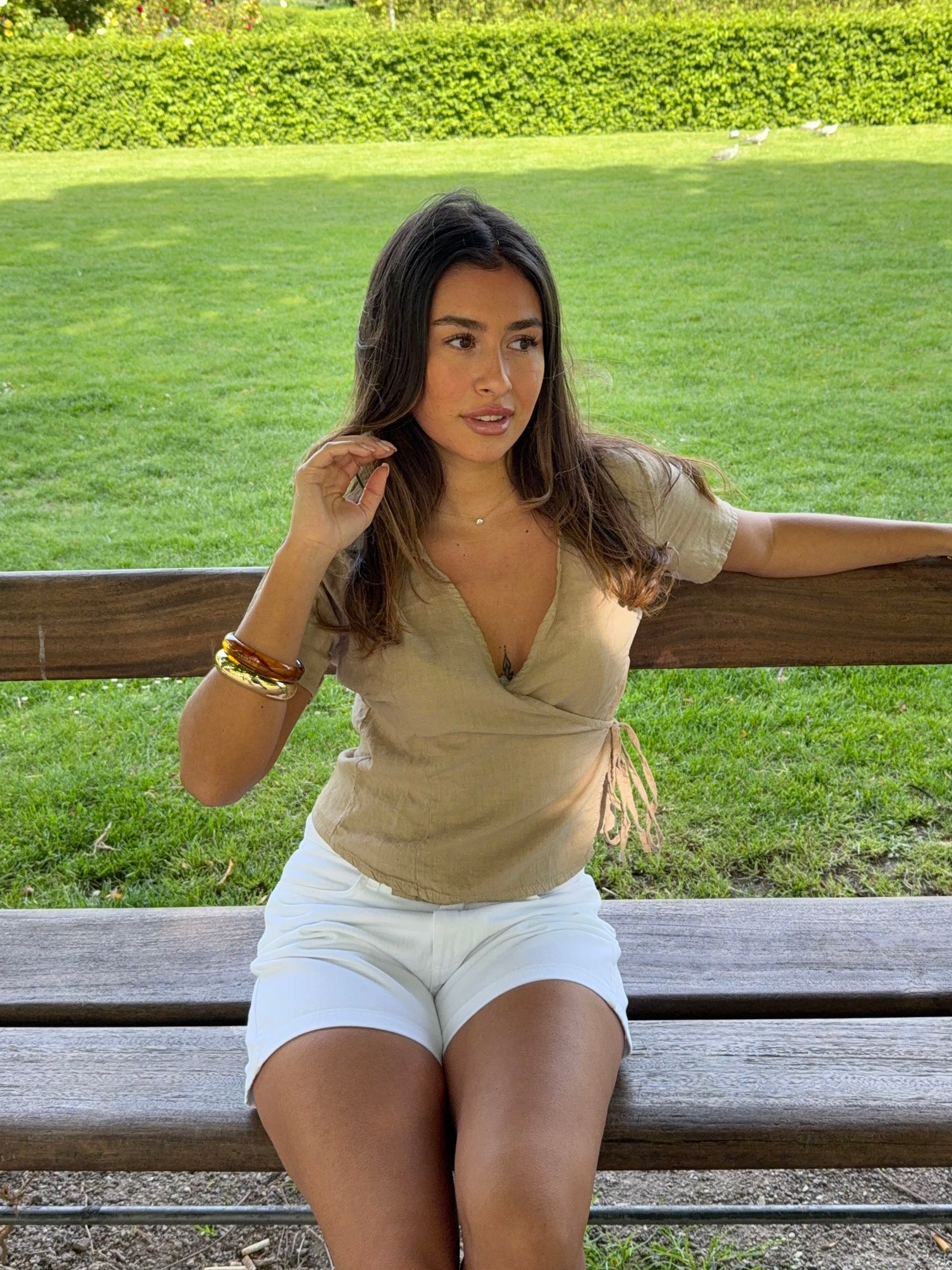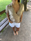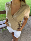 This soft beige wrap blouse blends simple elegance with everyday comfort. The flattering V-neckline and waist tie accentuate the figure, while the short sleeves and loosely woven fabric offer breathability and ease of movement. A perfect choice for both relaxed days and summer occasions—easy to style with jeans, shorts, or a skirt.