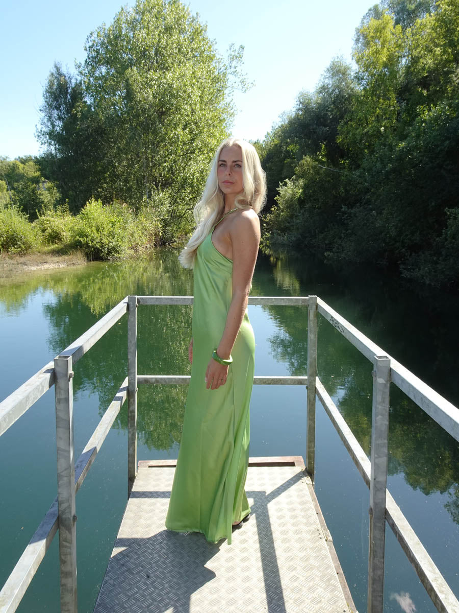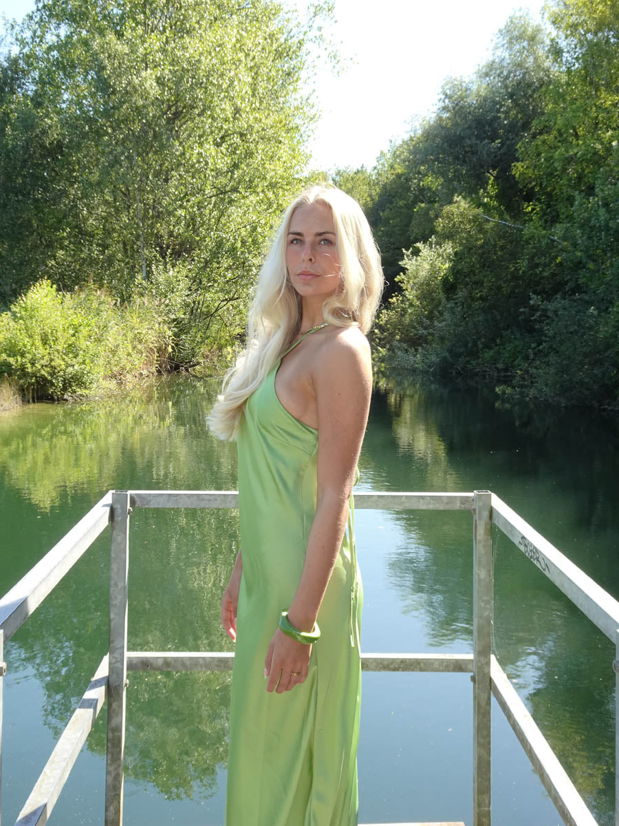 The Talia dress is a beautiful and elegant satin dress in a fresh green color. It features a halterneck design with thin straps and a glossy finish, giving it a luxurious look. The long, flowing cut makes it perfect for summer parties, weddings, or other special occasions where you want to stand out with a stylish and feminine look.