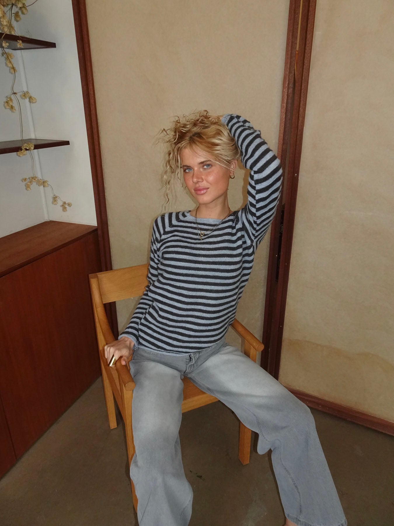 This striped knit is a classic and refined choice that fits perfectly into any wardrobe. The narrow stripes in black and grey create a timeless look, making the sweater easy to pair with jeans, trousers, and skirts alike. The design is simple yet elegant — ideal for those who love relaxed fashion with a sophisticated twist.