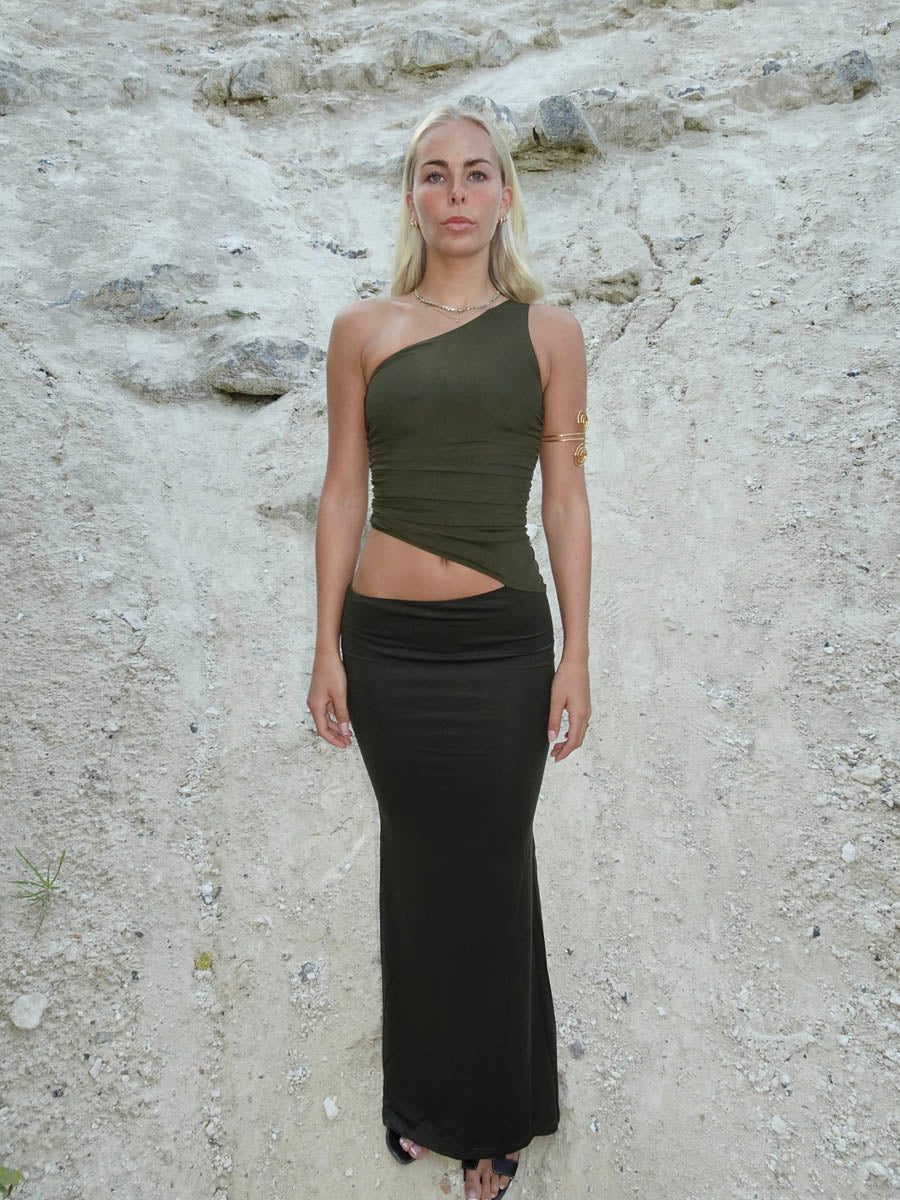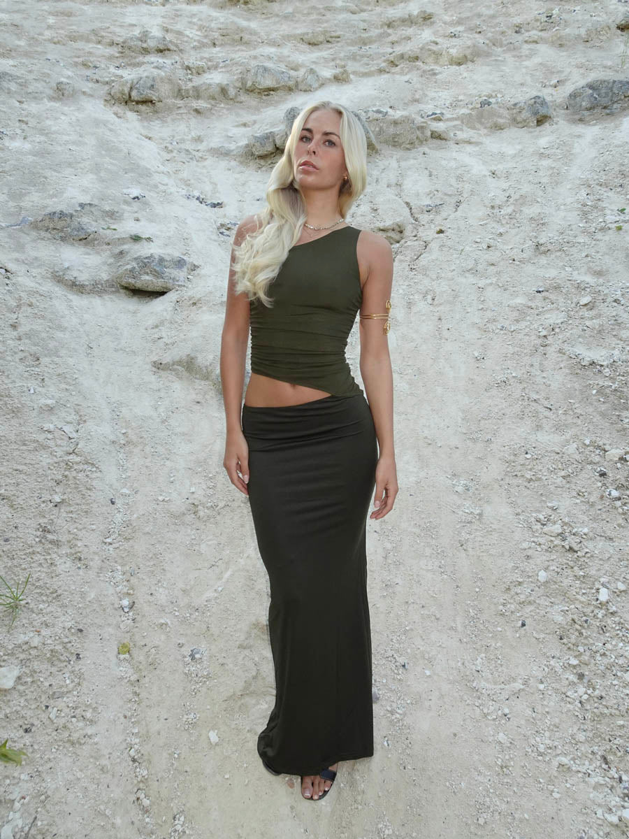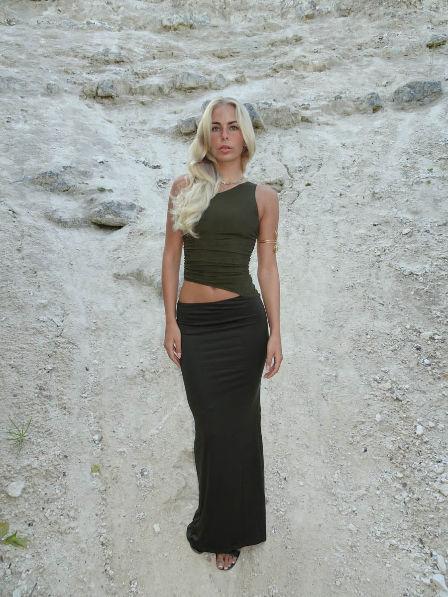 An elegant maxi dress in a deep dark green color. The dress features a flattering waistline that accentuates the figure, while the long flowing cut creates a stylish and feminine look. The slightly stretchy material makes it both comfortable to wear and easy to move in. This dress is perfect for festive occasions as well as a stylish everyday dress.