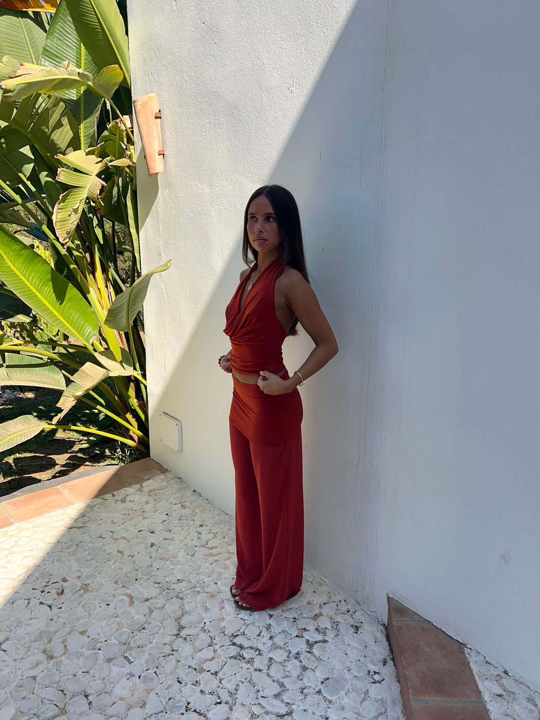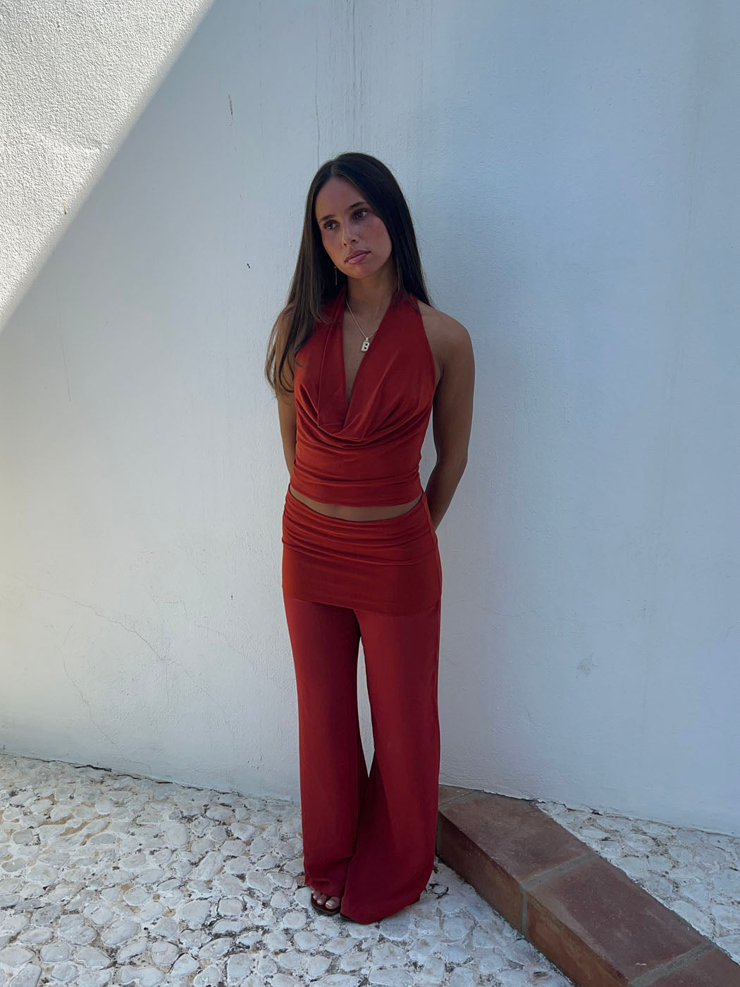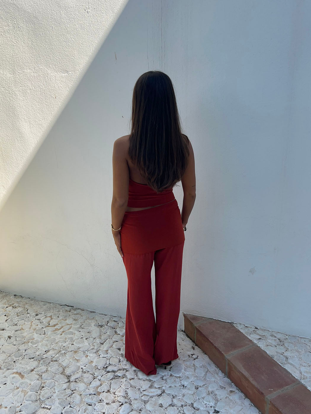 These red trousers combine comfort and style in perfect harmony. The light, smooth fabric drapes elegantly, creating a flattering look, while the elastic waistband ensures a comfortable fit all day long. The vibrant red color adds energy and personality to any outfit – perfect for both everyday wear and festive occasions.
