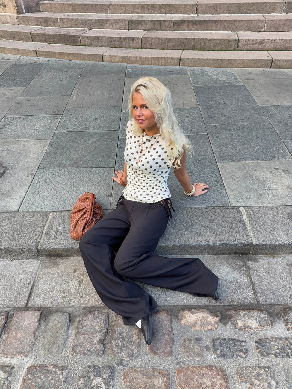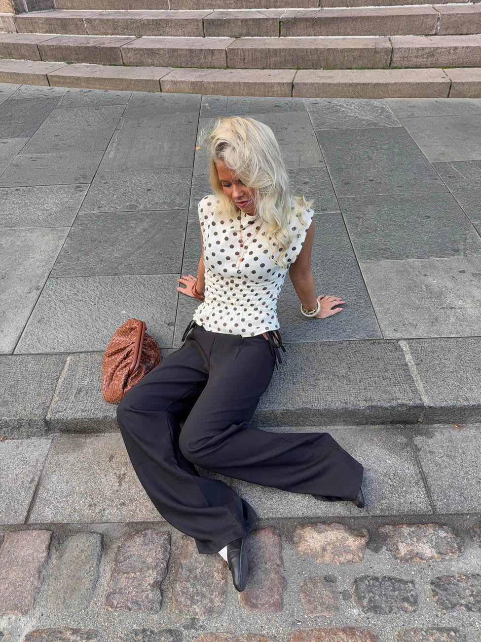 A feminine top with a playful dotted pattern. Knitted in a soft, lightweight quality, the top features elastic shirring details that create a flattering fit and a modern look. The white base color with brown dots makes it easy to style with jeans, skirts, or shorts. Perfect for both everyday wear and more festive occasions.