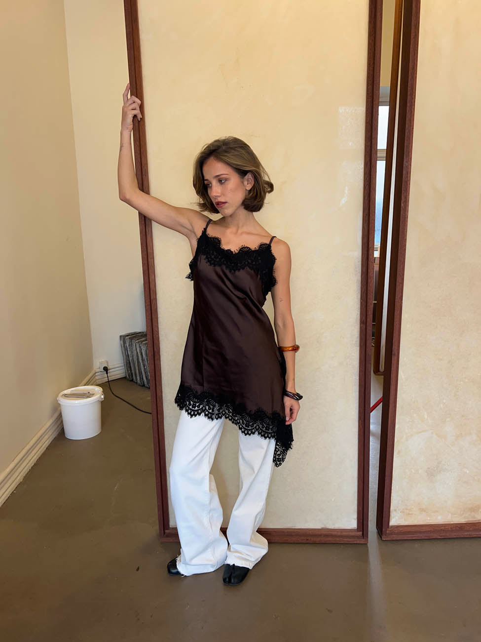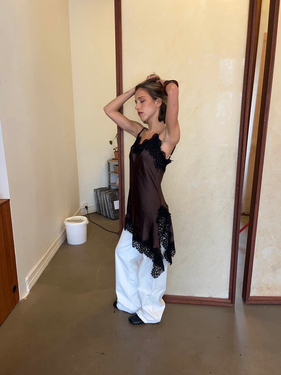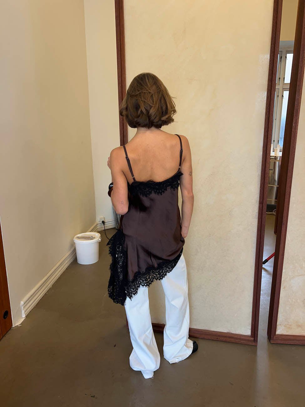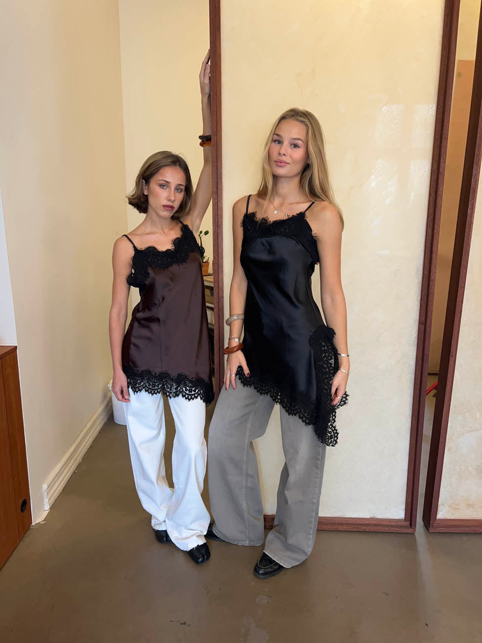 Feminine, elegant, and easy to style β the Dixie dress is the perfect choice for both everyday wear and special occasions. This beautiful dress comes in a deep brown shade with delicate black lace trims that add a sophisticated touch. The fine spaghetti straps and V-neckline highlight the feminine silhouette, while the lace along the edges enhances the elegant look.