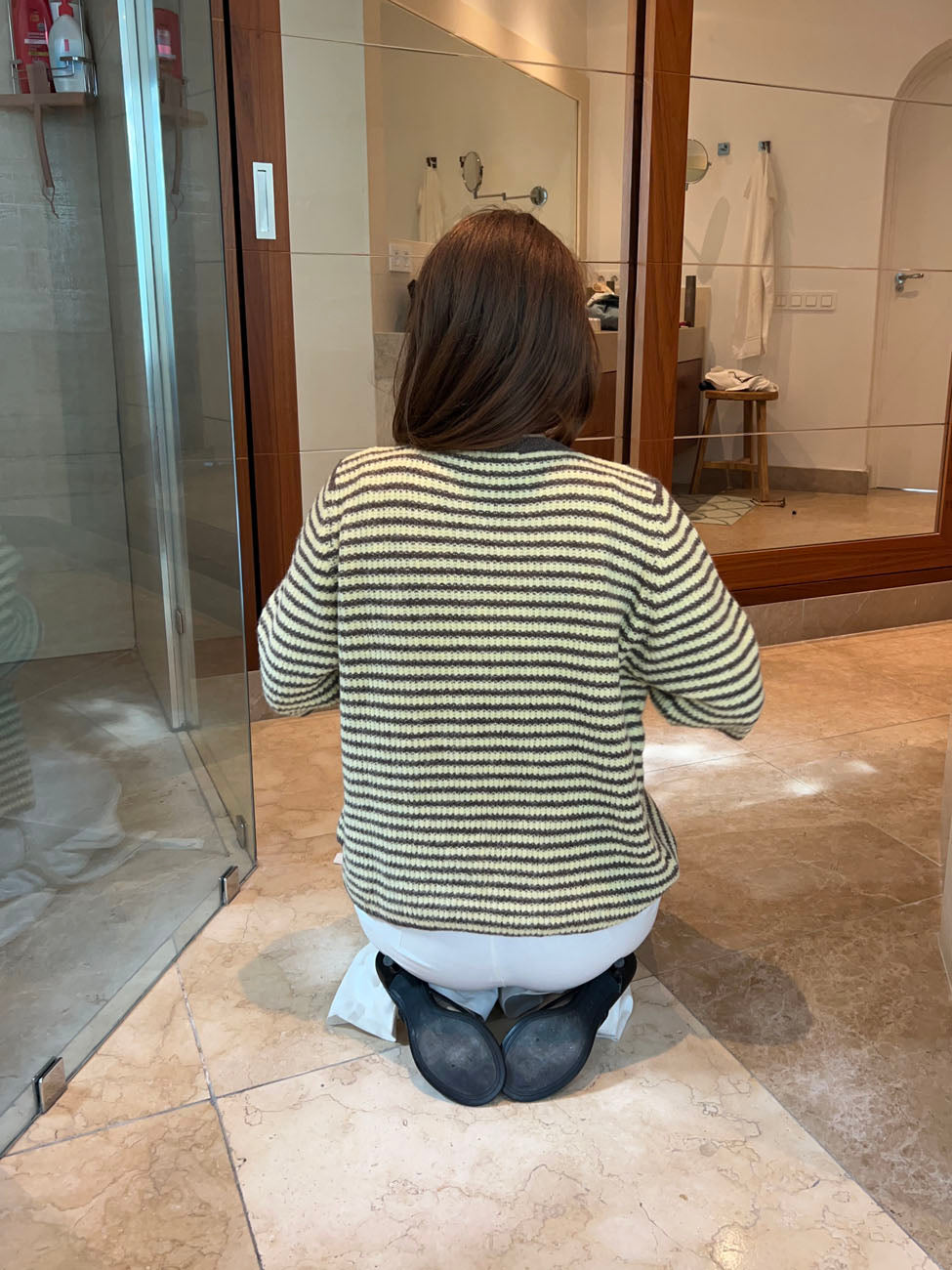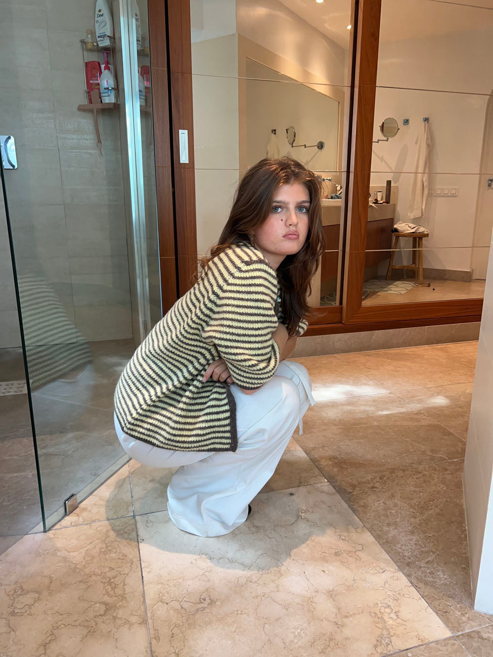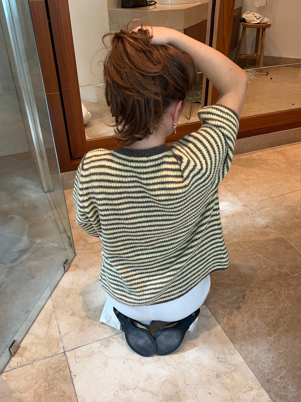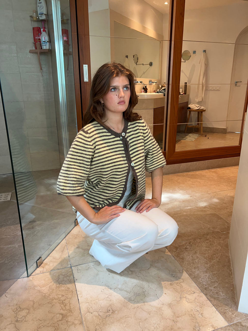The soft knit in beige and brown creates a timeless look, while the short sleeves and relaxed fit add a casual, summery feel. The cardigan fastens with small front buttons and features a rounded neckline for a feminine touch. The simple stripe pattern brings a lively expression, making it easy to style — wear it over a dress, with jeans, or as a light layer on cooler days. A versatile favorite that brings both comfort and style to your wardrobe.