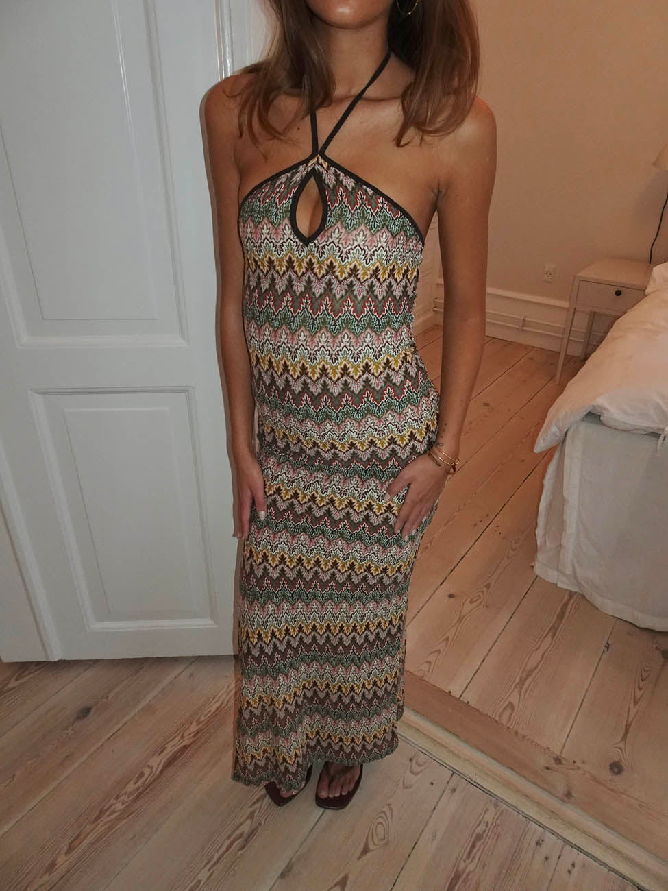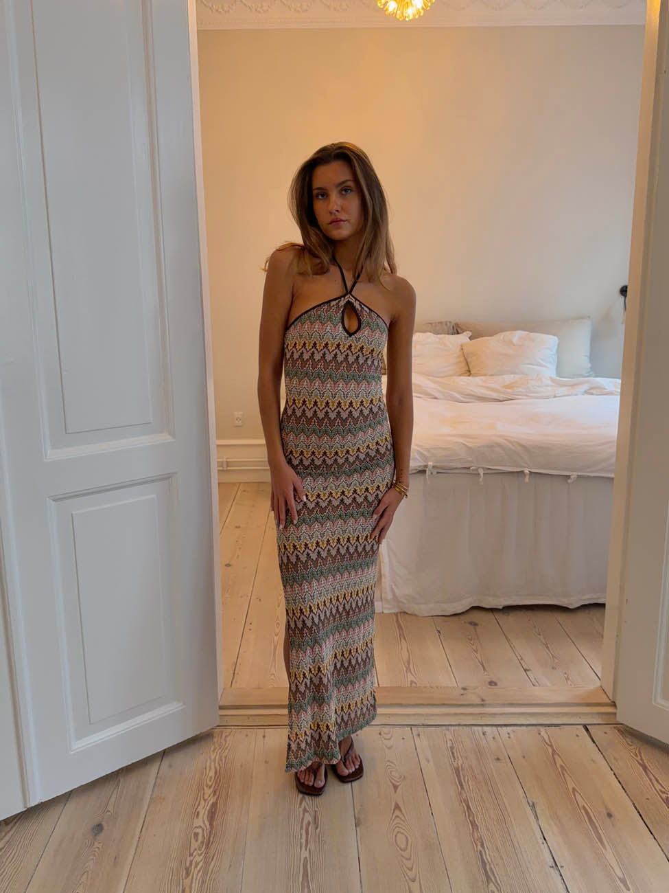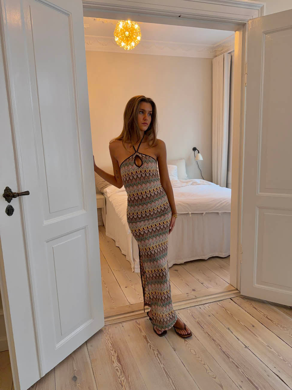 This patterned dress blends bohemian style with effortless elegance. The colorful zigzag pattern in shades of brown, green, pink, and yellow creates a vibrant and feminine look, while the soft and stretchy material offers a flattering fit and high comfort. The fitted upper body and gently flowing skirt highlight the silhouette naturally, and the strap details add a summery, laid-back touch. Perfect for warm days, vacations, and relaxed celebrations where you want to combine comfort with a hint of colorful luxury.