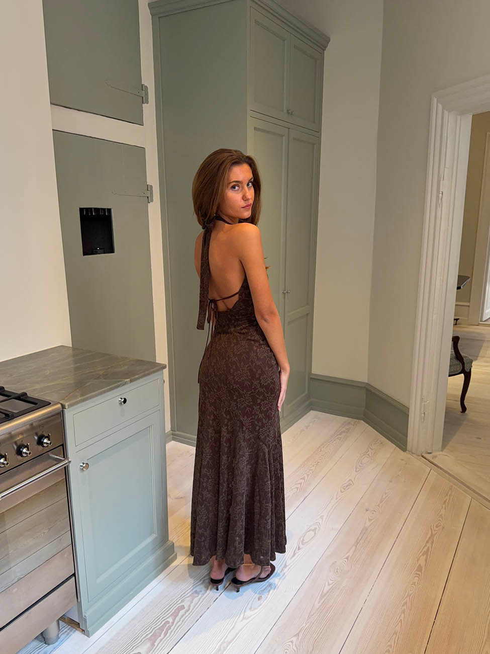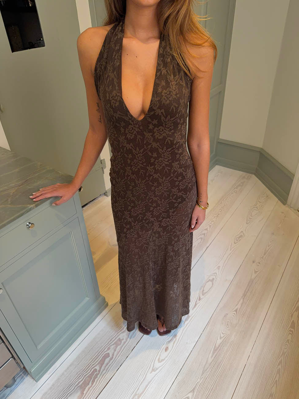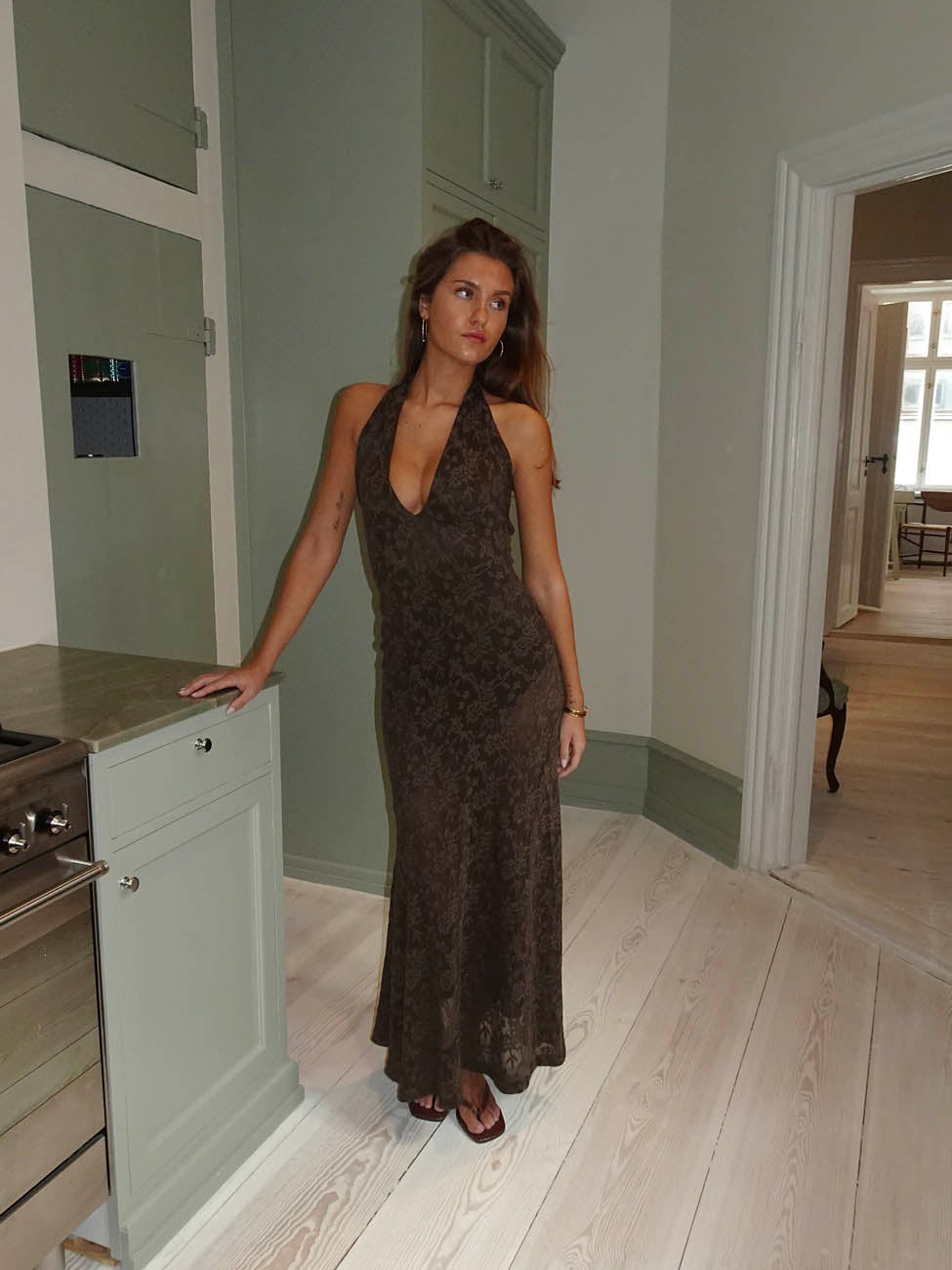 This beautiful brown maxi dress blends an elegant, vintage-inspired look with a flattering silhouette. The dress is made from a soft, stretchy material with a subtle floral pattern that adds an exclusive and feminine touch.