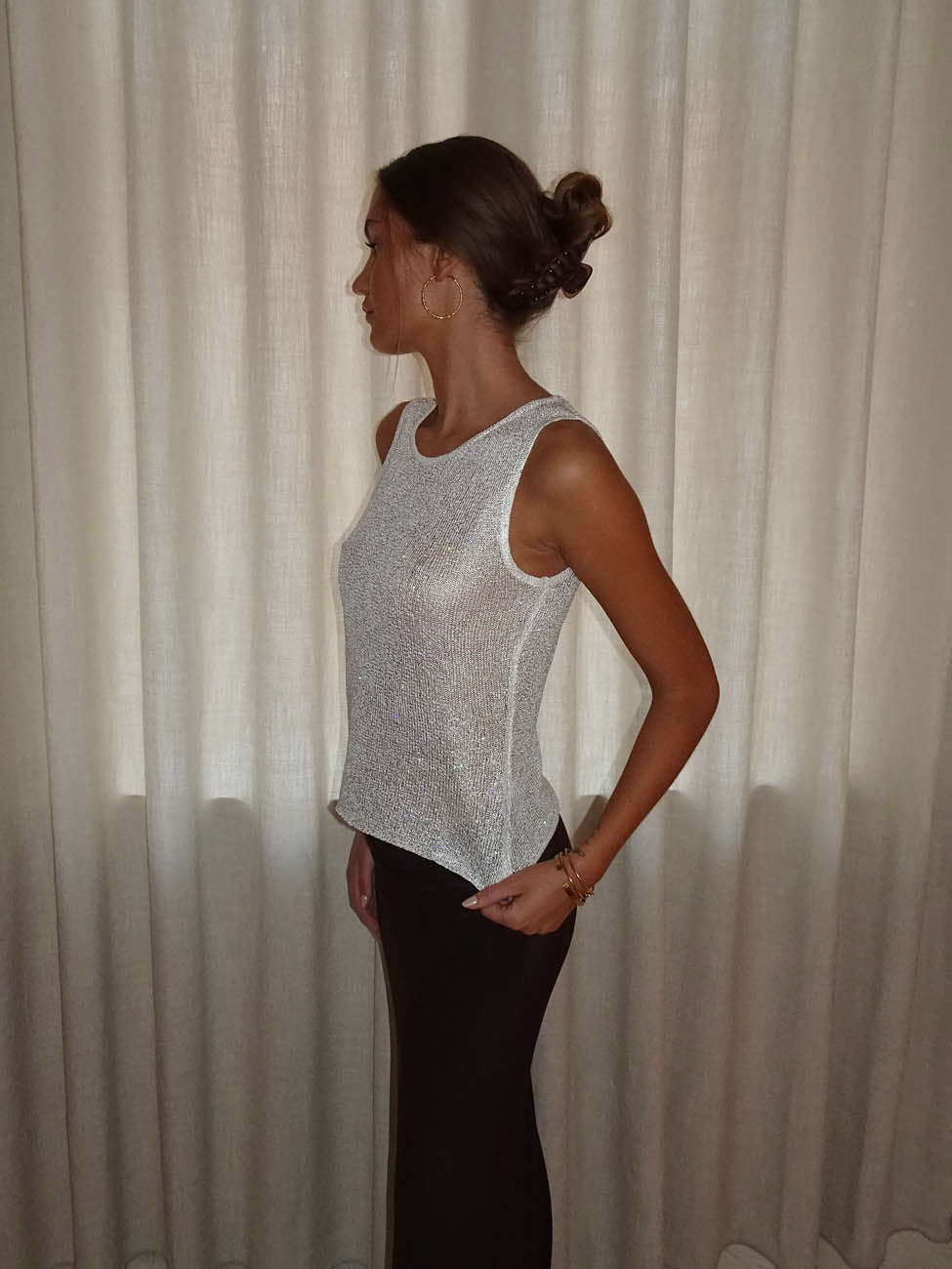 This beautiful white shimmering top combines simple elegance with a festive twist. The lightweight knitted material drapes beautifully and offers a comfortable stretch, while the subtle metallic threads create a luxurious shine that catches the light in all the right ways. The sleeveless fit and round neckline make the top both feminine and versatile — perfect for everything from nights out and festive events to a chic everyday look styled with a blazer or high-waisted trousers.