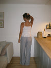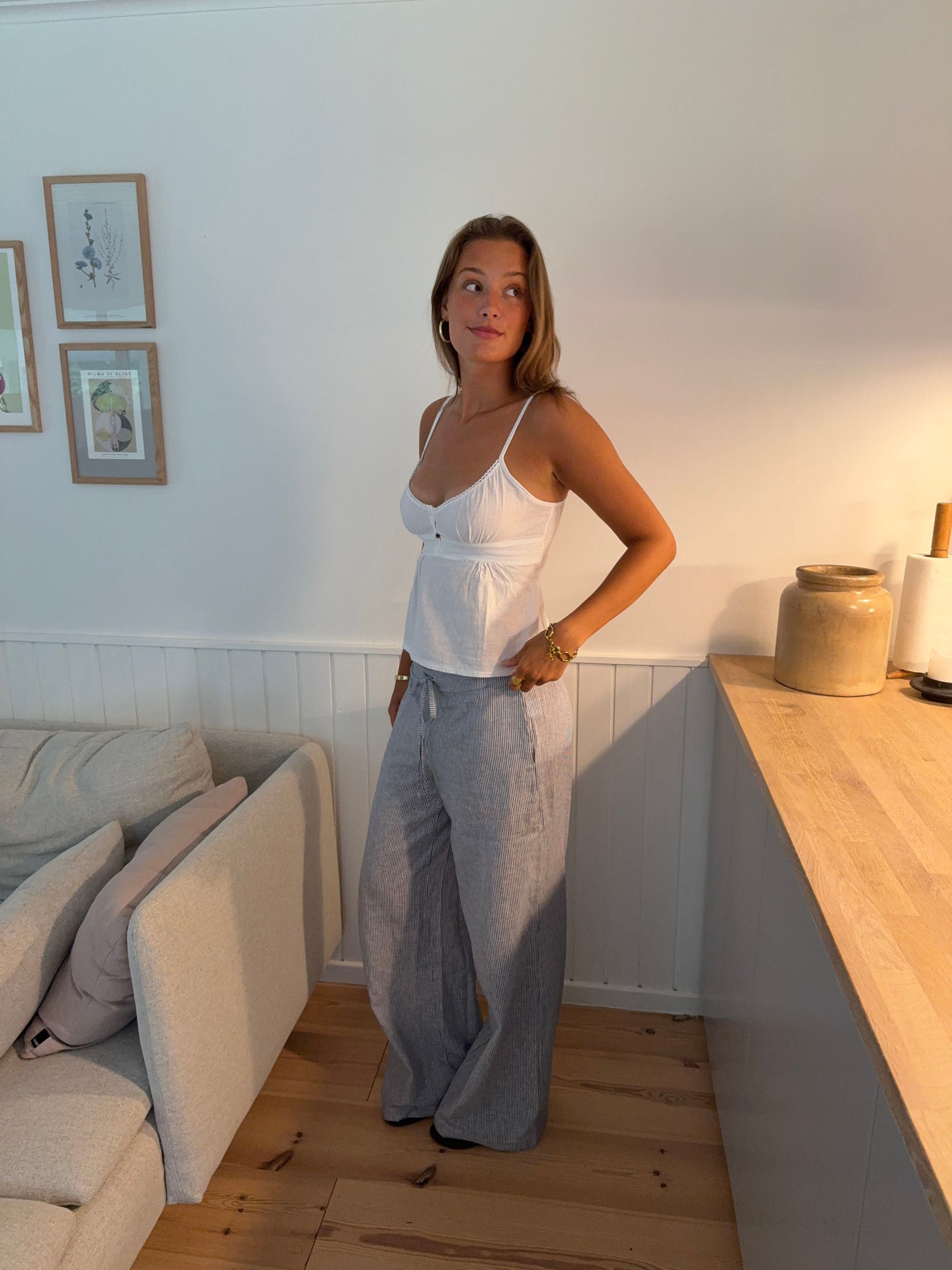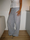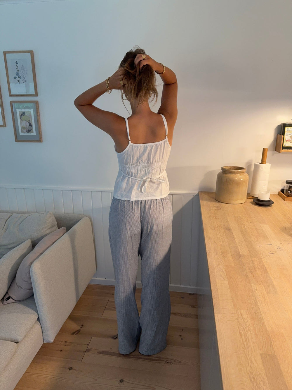 These striped trousers in blue and white offer a relaxed yet stylish look. Made from a lightweight and breathable fabric, they feature a loose fit that ensures all-day comfort. The elasticated waistband with drawstring allows for an adjustable and flexible fit. Perfect for everyday wear and breezy summer occasions.