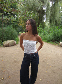 This top is perfect for festive events. The top has a bandeau fit, is close-fitting, and has an elastic lace material. It has an extra layer around the bust, which makes it less see-through.