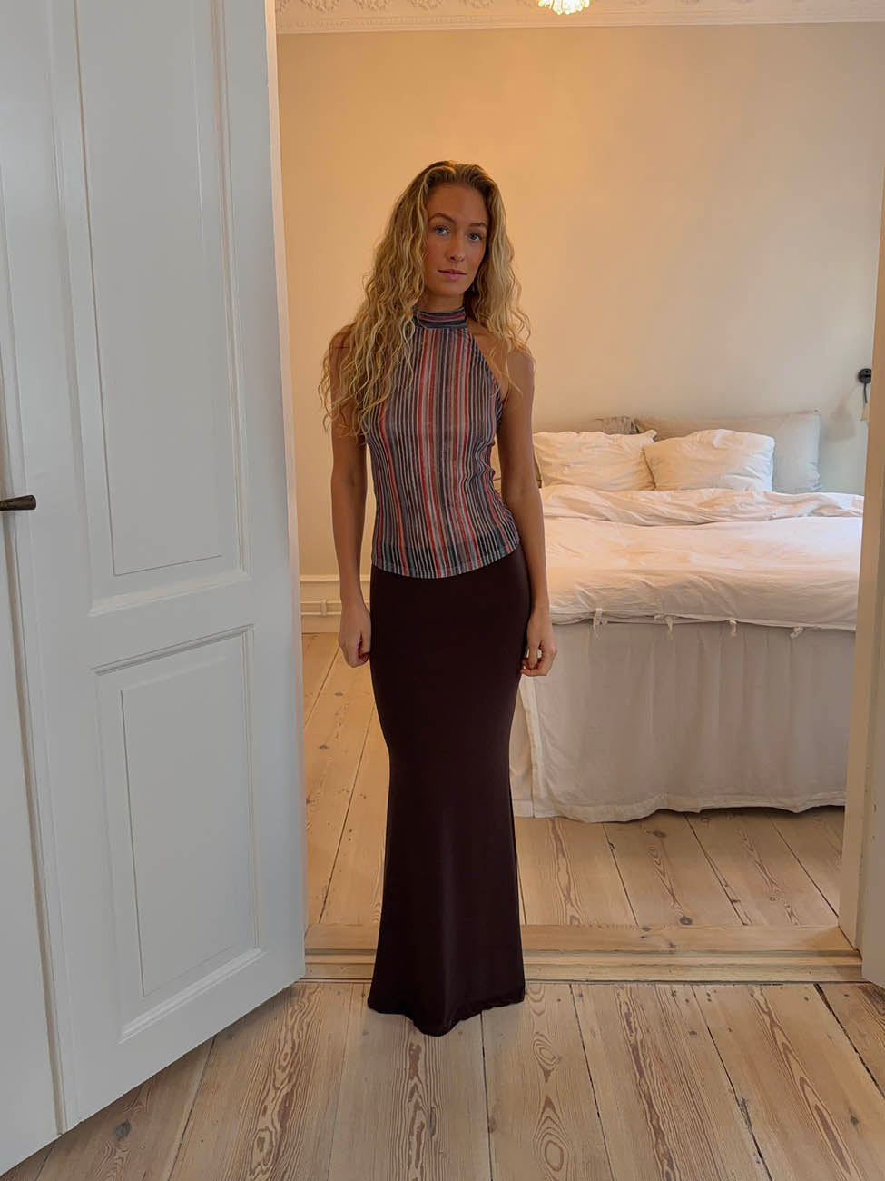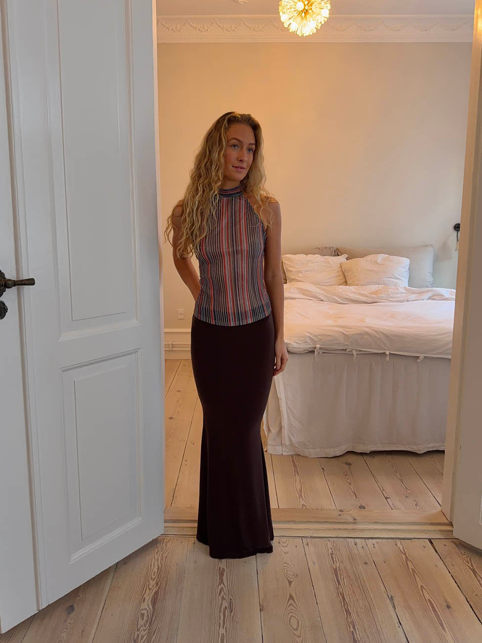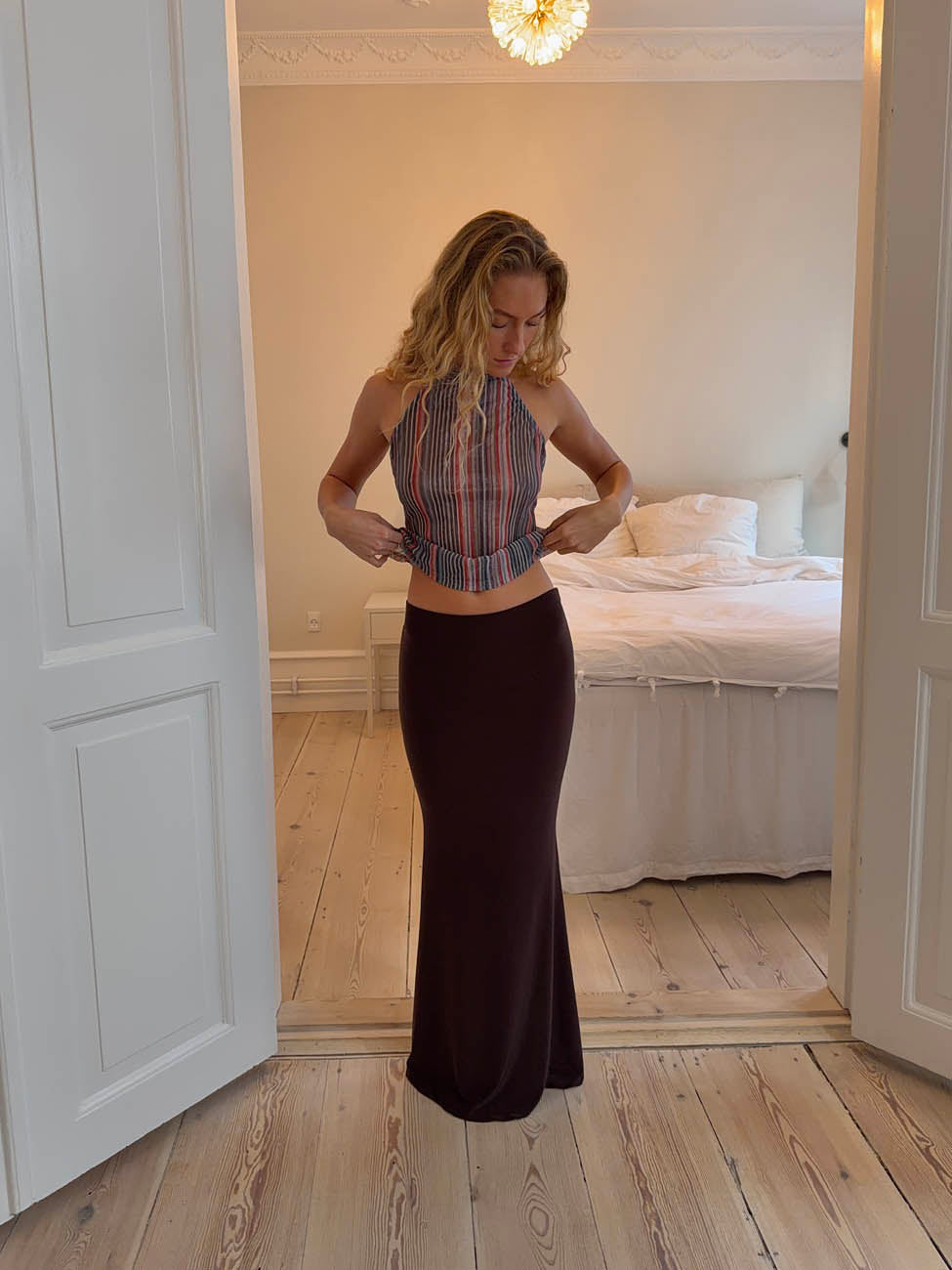 This beautiful brown maxi skirt is made from a soft, lightly stretchy material that drapes elegantly and creates a smooth, flattering silhouette. The skirt features a simple and timeless design, making it easy to style for both everyday wear and special occasions — pair it with a fitted top for a feminine look, or combine it with a chunky knit for a more casual vibe.