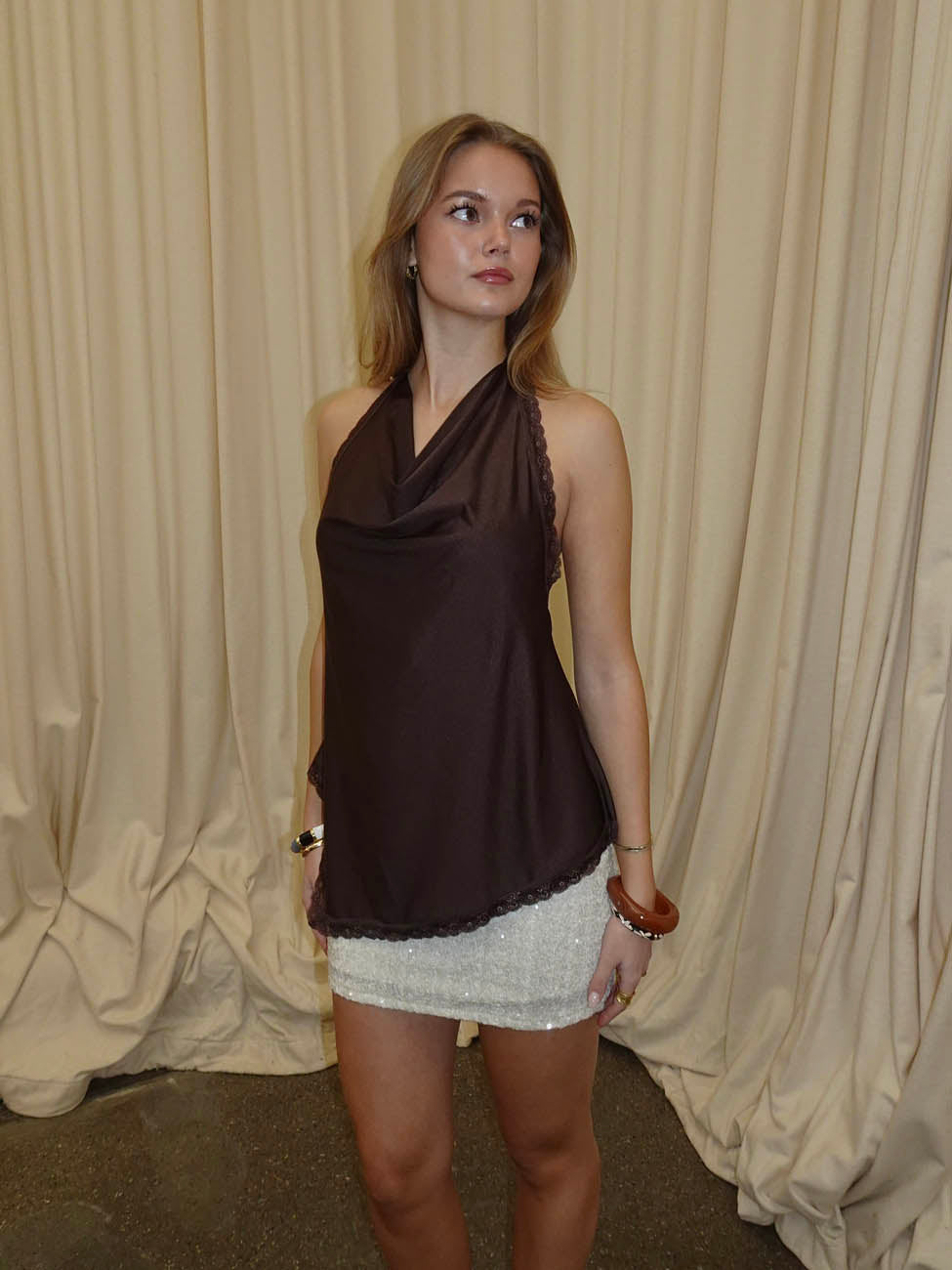 This beautiful halterneck top in a deep brown shade combines simple elegance with a feminine touch. The top features a smooth, subtly shiny surface that drapes softly against the body, creating a sophisticated look. Along the edges, it is finished with delicate lace detailing, adding a romantic and refined touch.