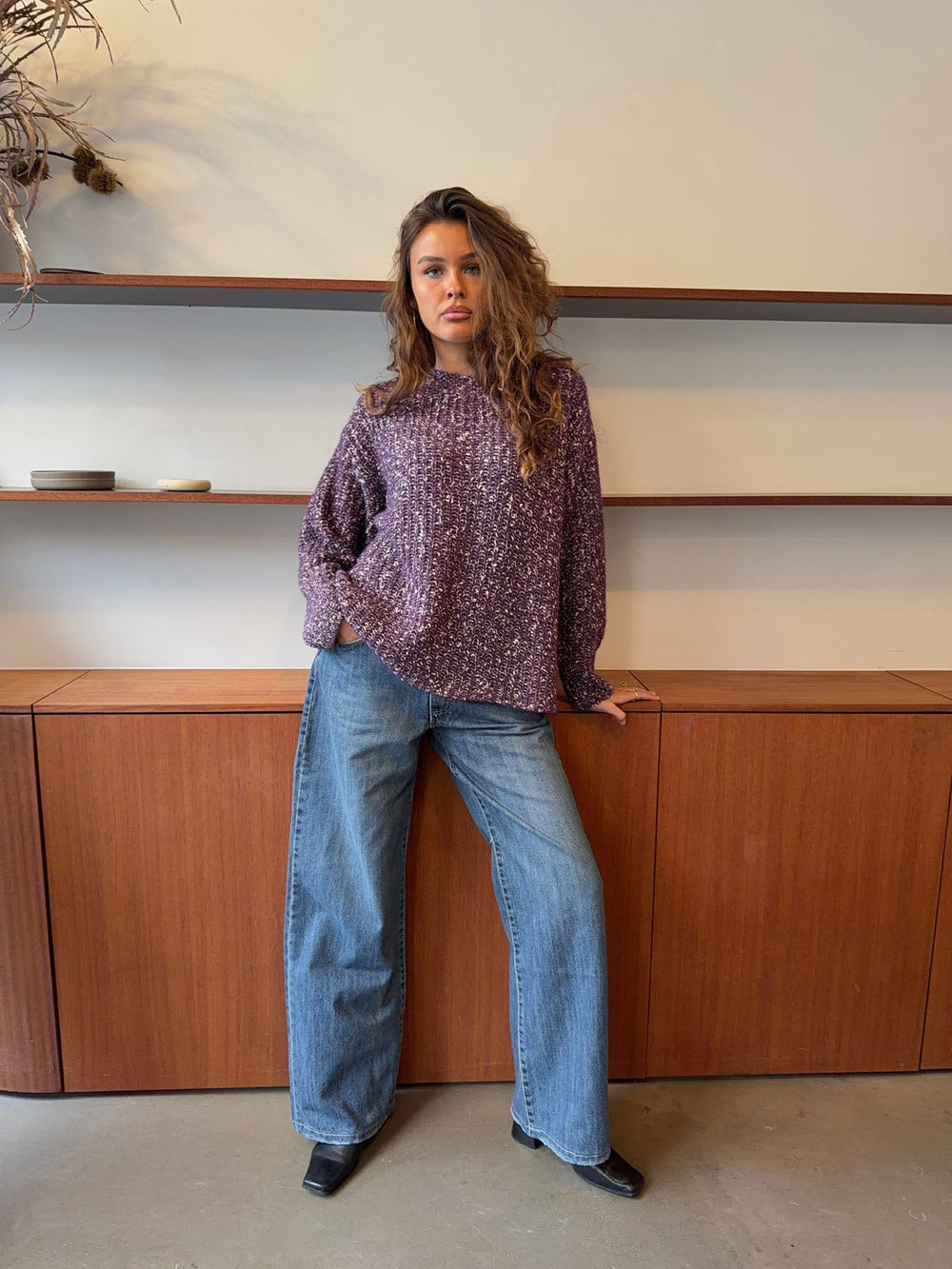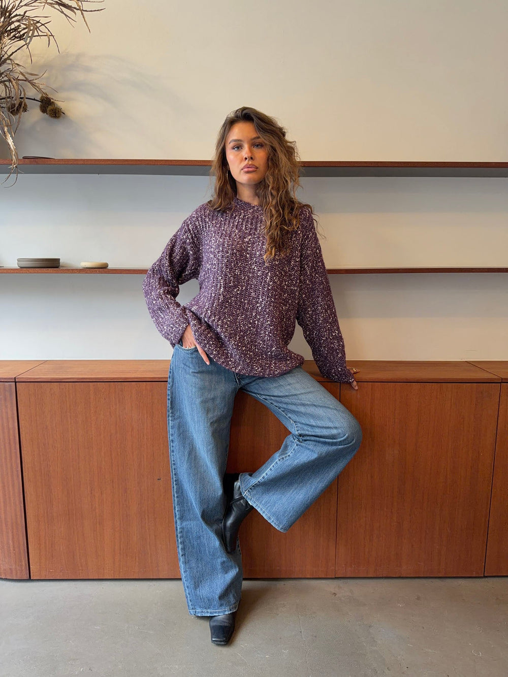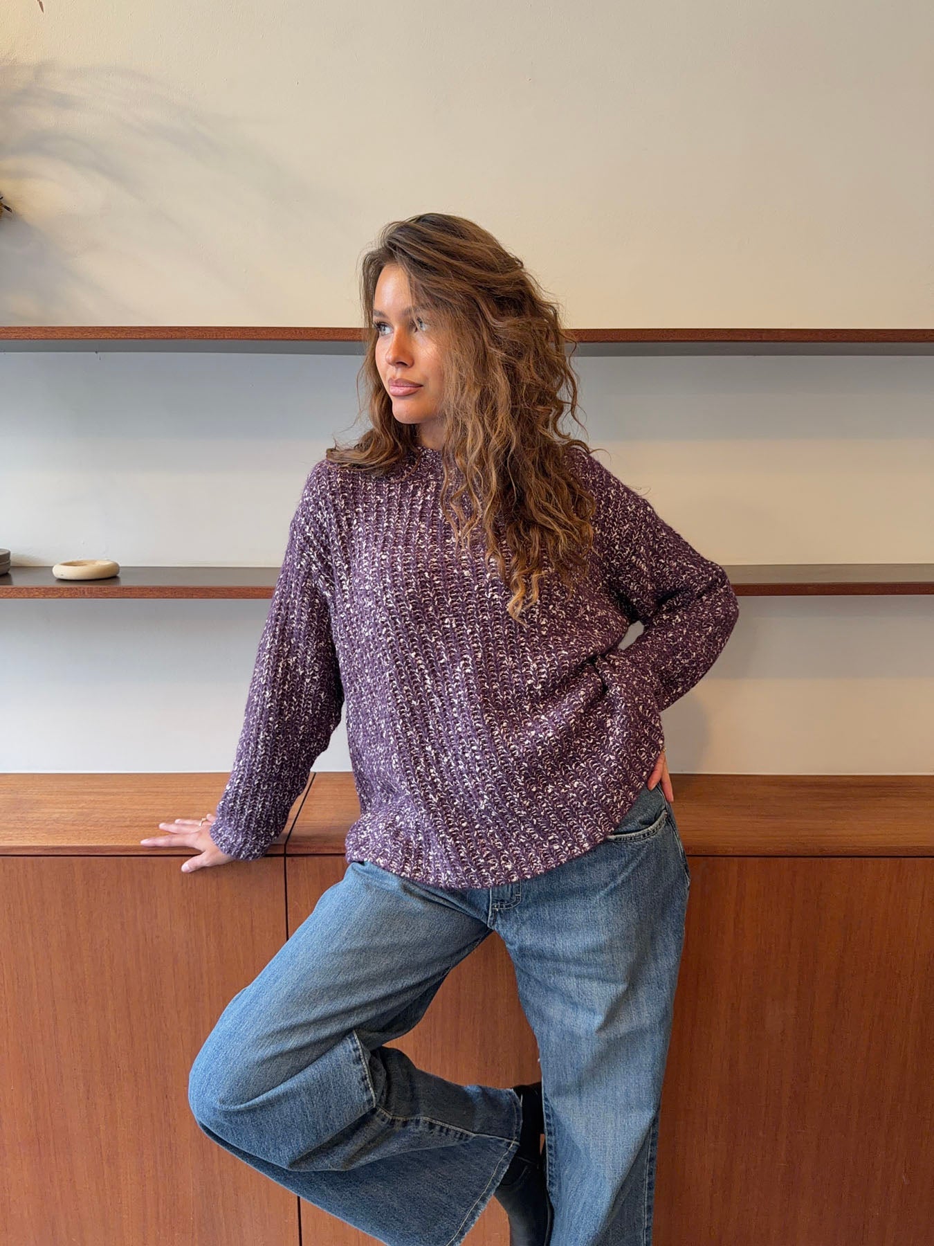 This chunky knit sweater in purple melange combines comfort with a modern, relaxed look. The soft knitted quality and slightly loose fit make it ideal for cooler days, while the delicate shades of purple and cream create a lively and feminine texture. The sweater features a classic round neckline, making it easy to style with everything from jeans to skirts. A timeless favorite that blends warmth, style, and effortless everyday comfort.
