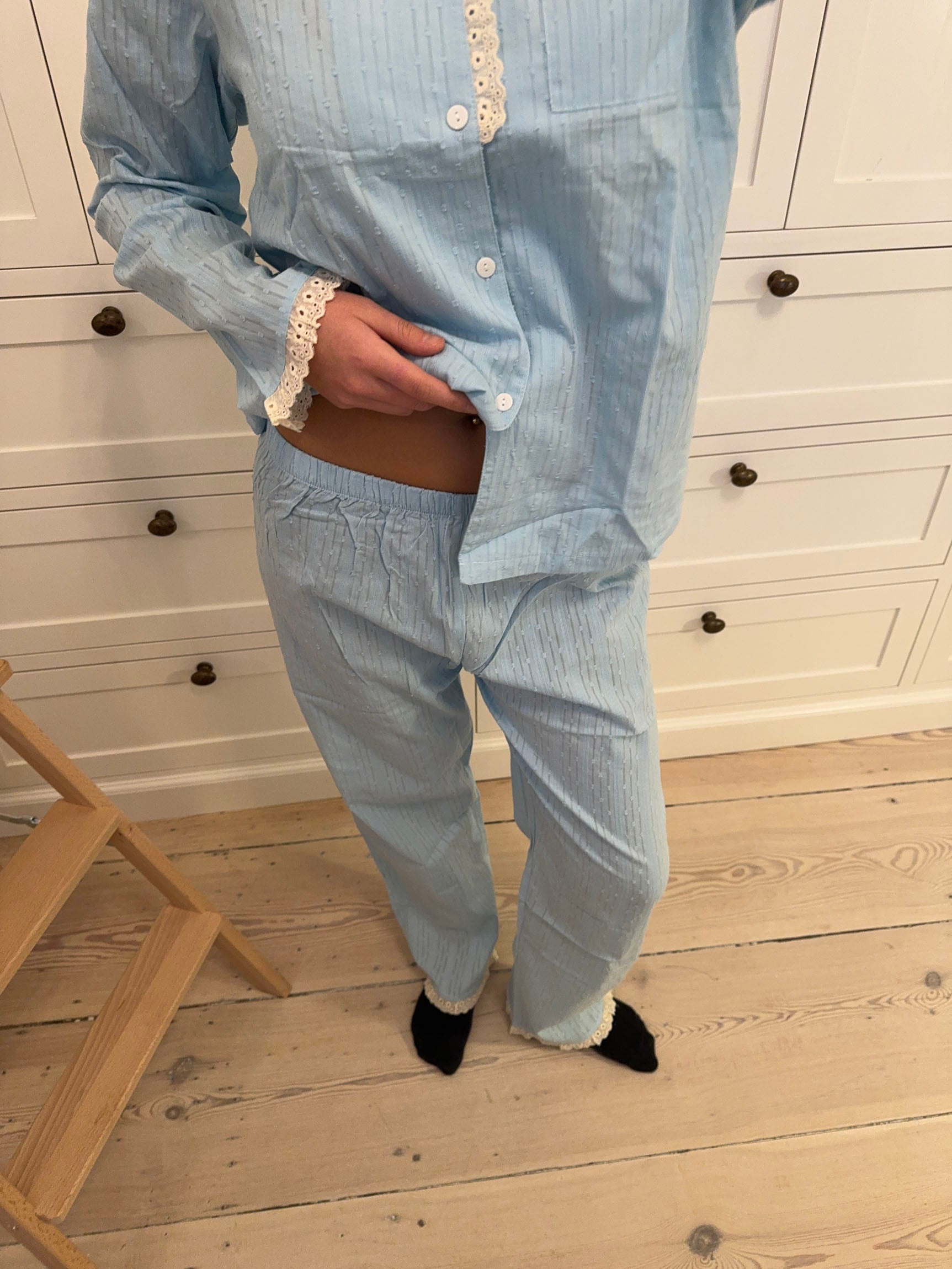 This pyjamas set in light blue with lace is both cute and comfortable, making it perfect for the colder seasons. It comes in a light blue color with delicate lace trims that add a playful and feminine touch. With its loose fit and super-soft fabric, it feels amazing against the skin.