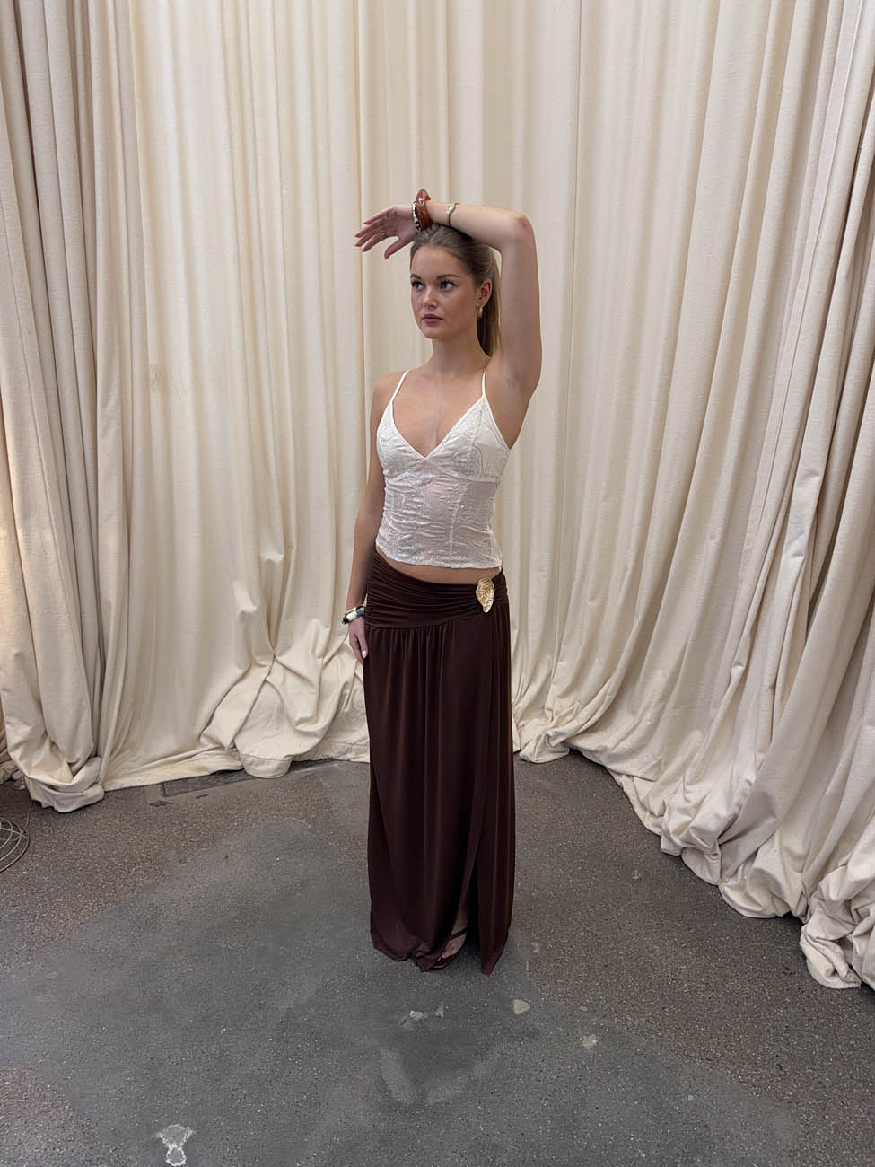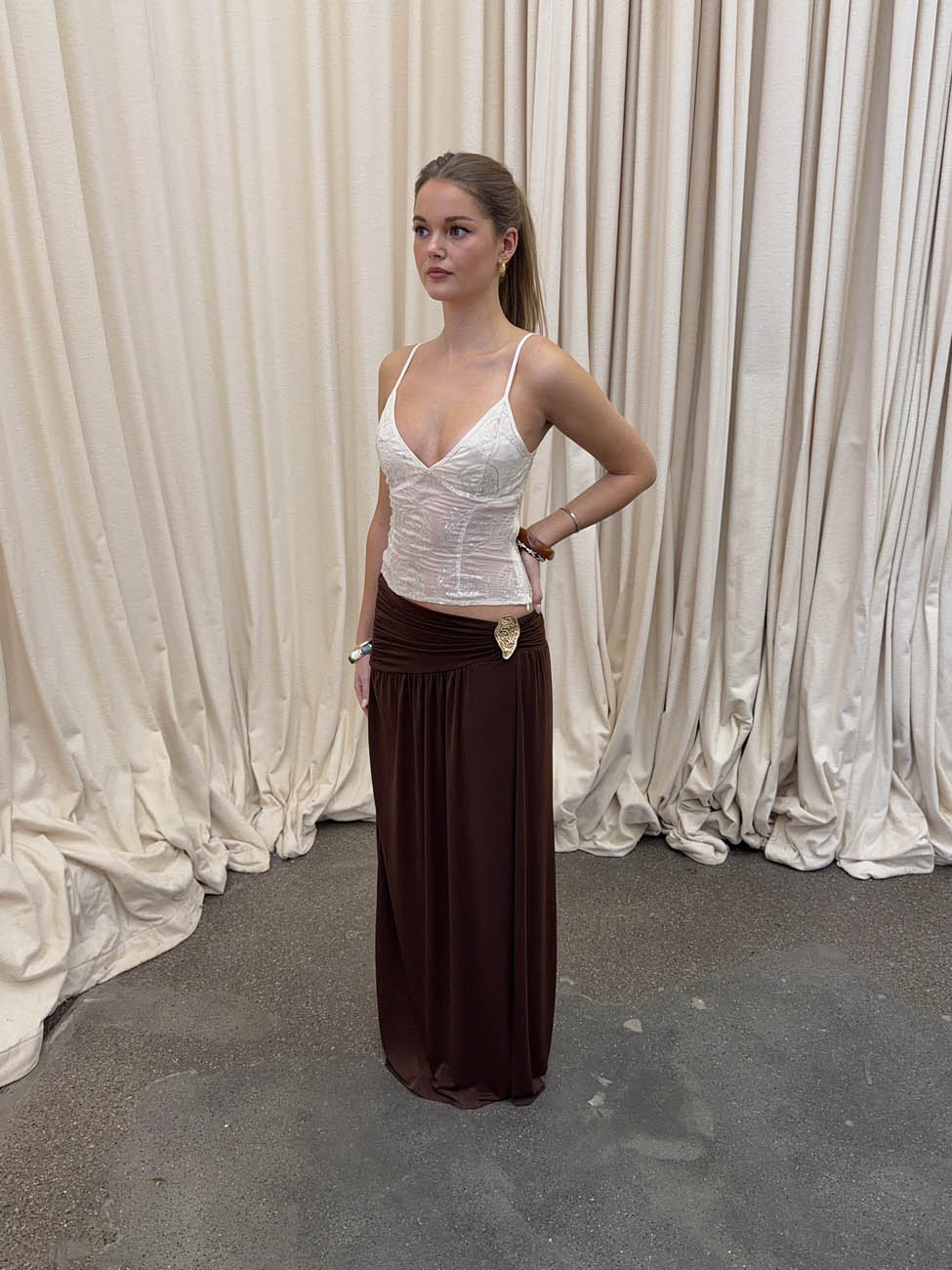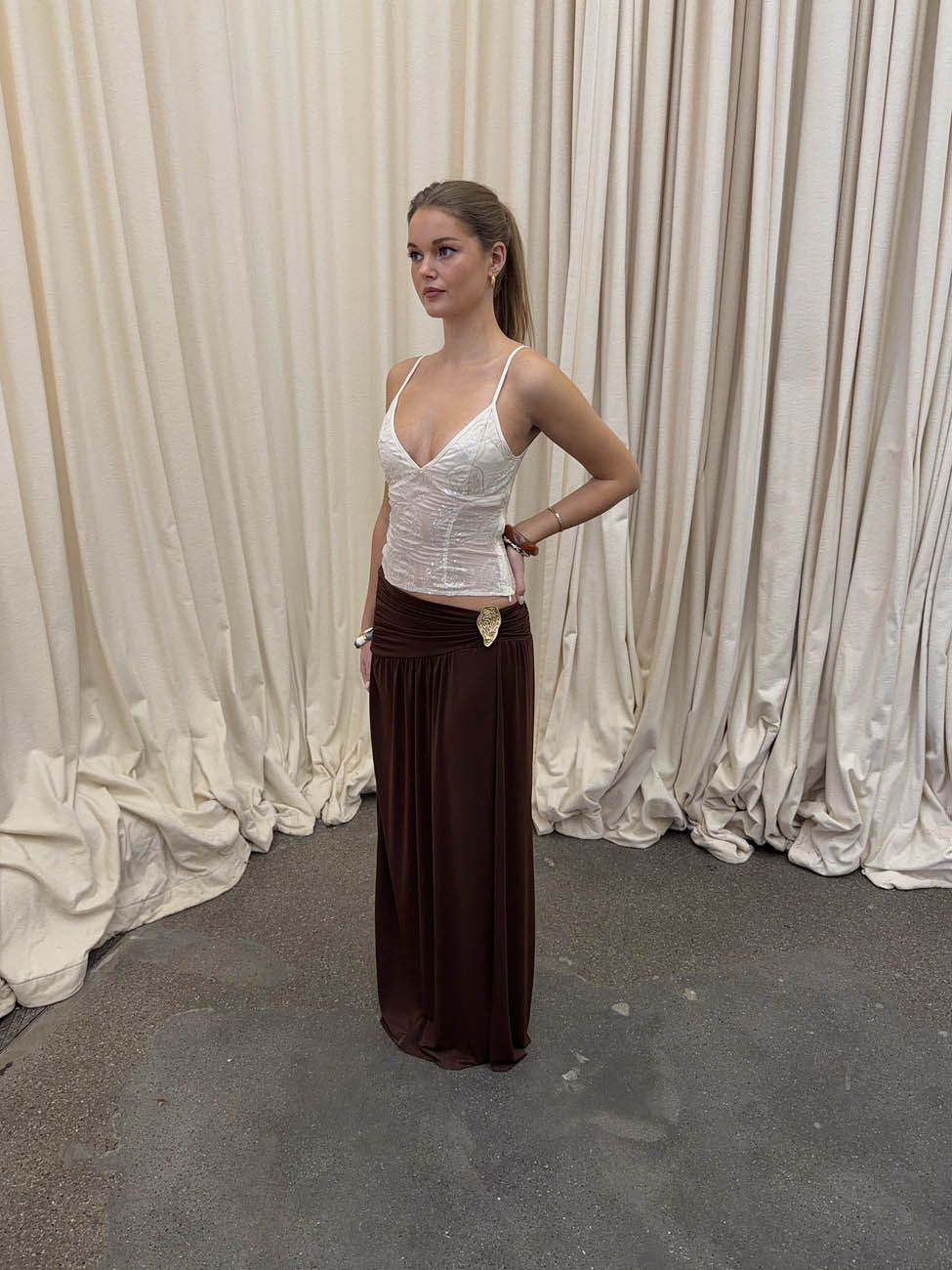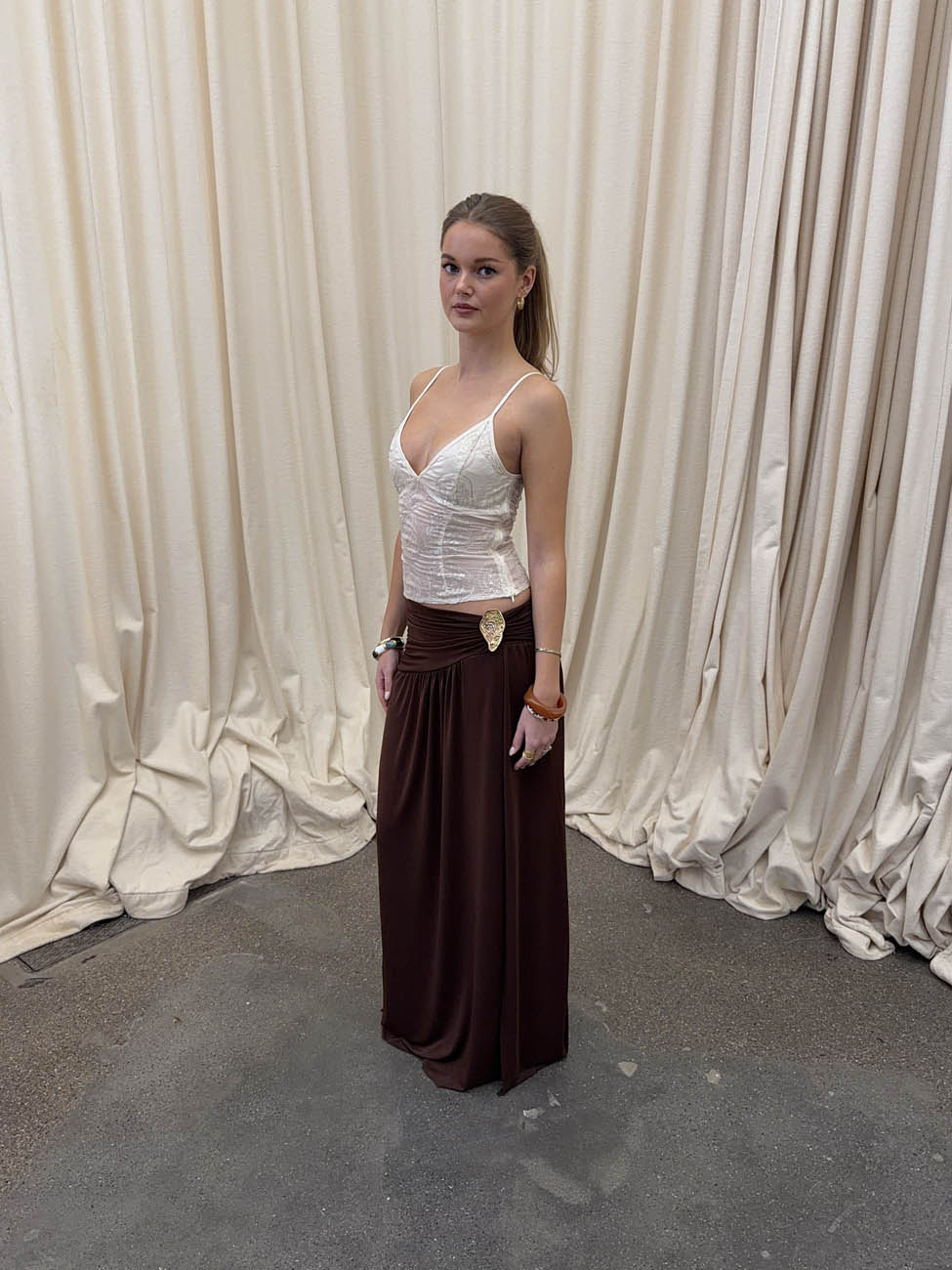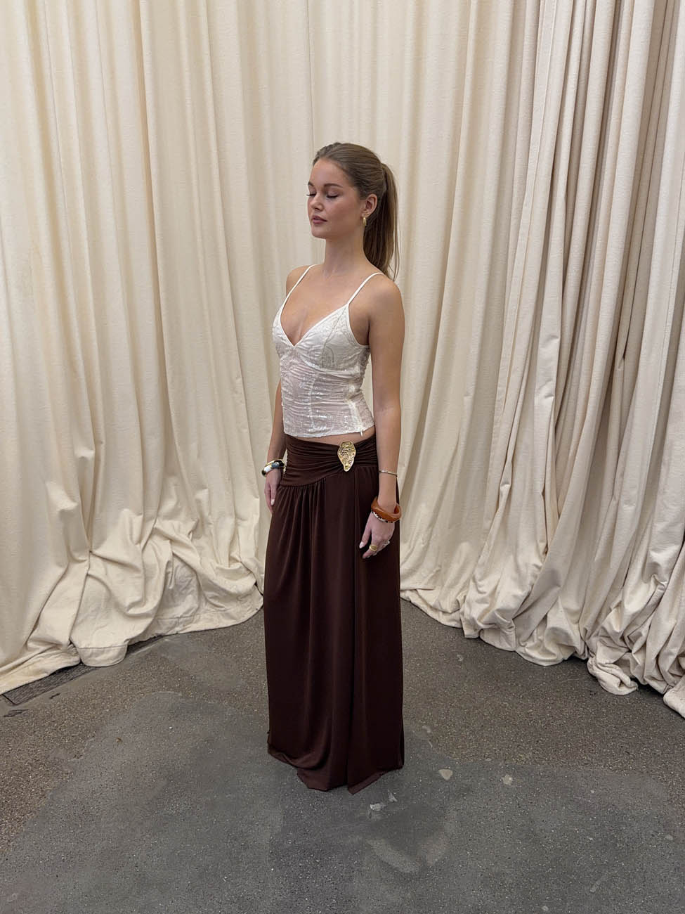 This elegant brown maxi skirt combines comfort with a luxurious and sophisticated look. The soft, subtly shiny fabric drapes beautifully around the body, creating a flattering silhouette. The draped detail at the front adds an exclusive touch, while the gold-toned decoration provides a refined and feminine finish.