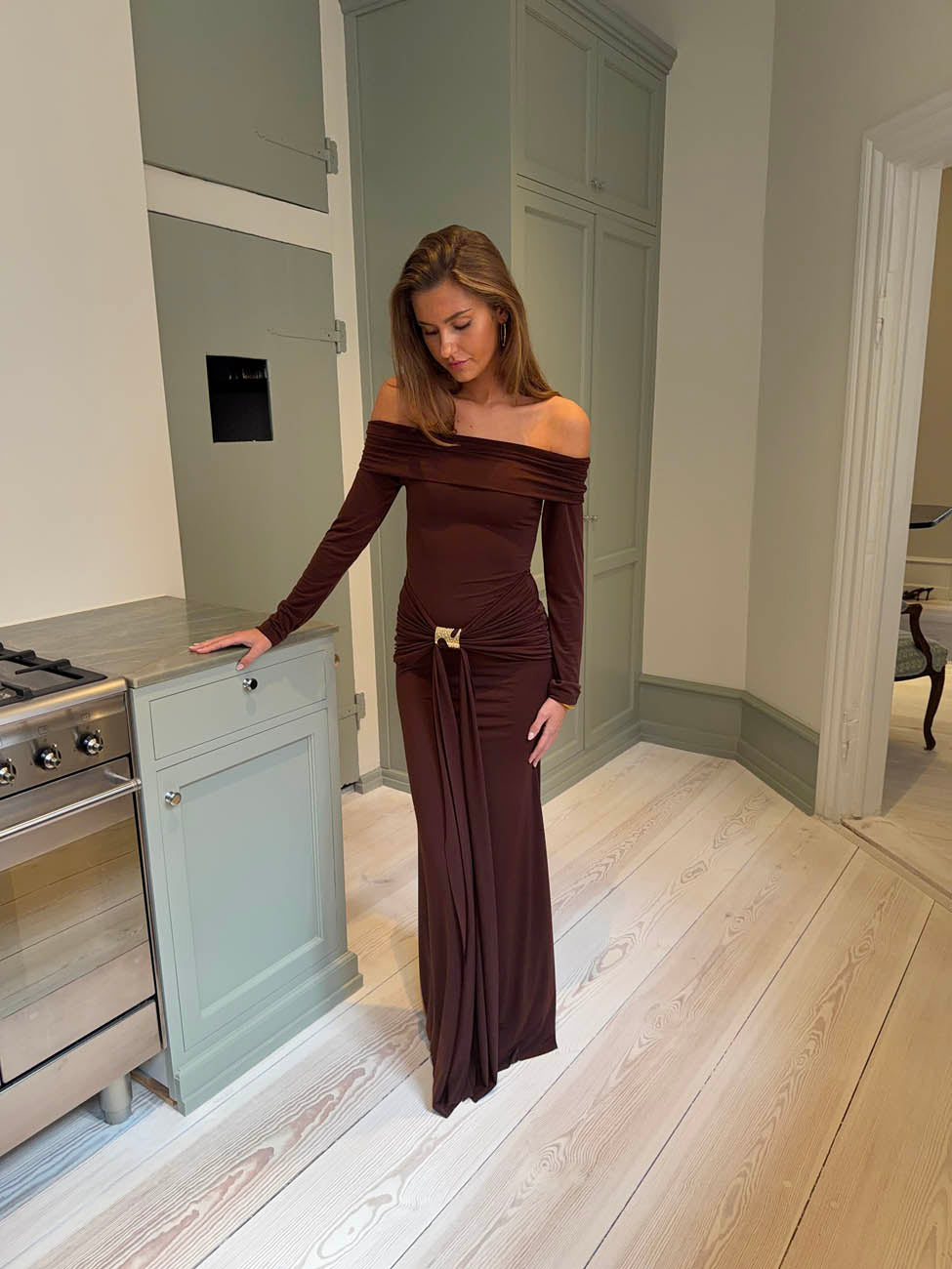 This elegant brown maxi dress is designed for those who want a sophisticated and exclusive look. The dress is made from a soft, lightly stretchy material that drapes beautifully and creates a flattering silhouette. The long, flowing skirt adds a feminine touch, while the striking draping at the waist is gathered with a beautiful gold buckle, enhancing the figure and adding a luxurious detail.