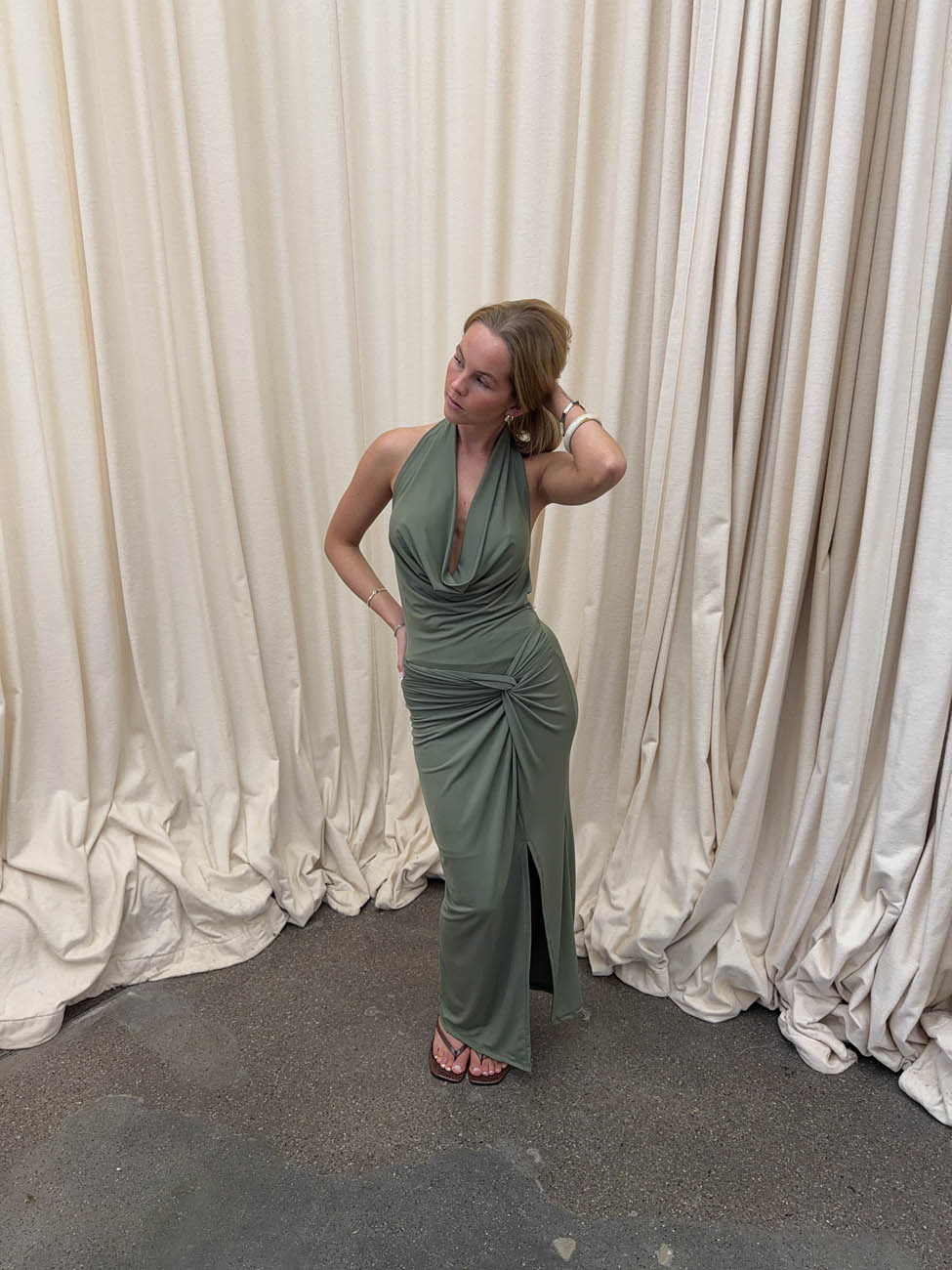 This elegant dusty green maxi dress is made from a soft, glossy stretch fabric that drapes beautifully and creates a long, streamlined silhouette. The dress features subtle ruching at the center, enhancing the waist and adding a refined, flattering touch.