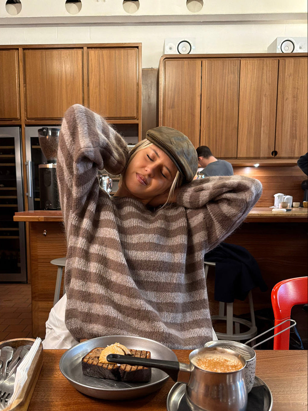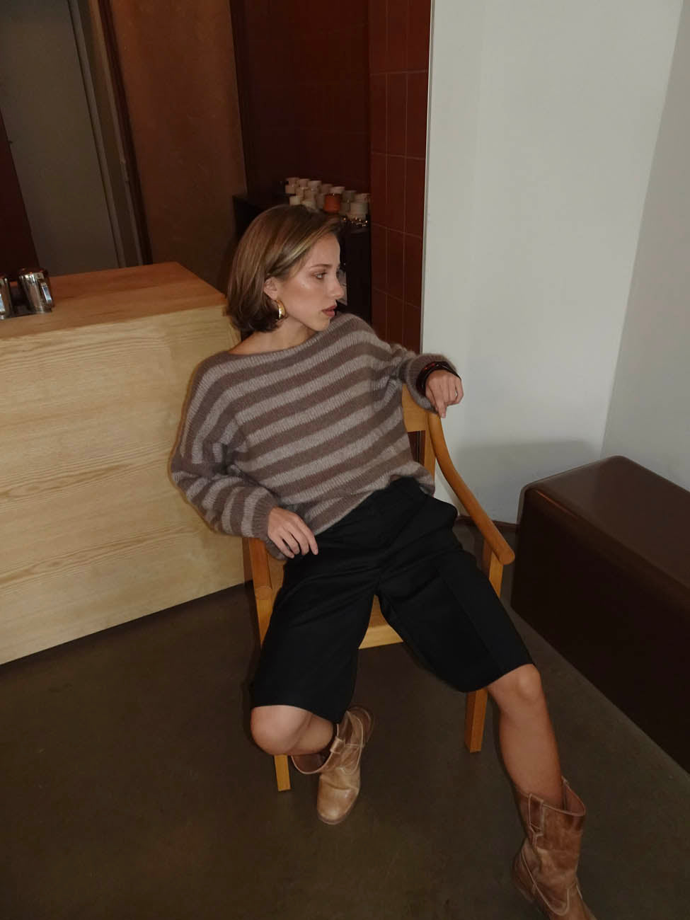Treat yourself to our soft and stylish Sissal knit sweater in brown tones. The sweater features wide, horizontal stripes in light beige shades, creating a classic and cozy look. Its loose fit and airy knit make it ideal for both everyday wear and relaxed weekends. Designed with a round neckline and long sleeves, it offers a timeless and casual expression.