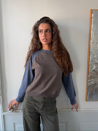 This clean and stylish knit sweater combines two harmonious colors in a modern, sporty design. The body features a warm melange brown tone, while the sleeves come in a beautiful deep blue, giving the sweater a unique and eye-catching look.