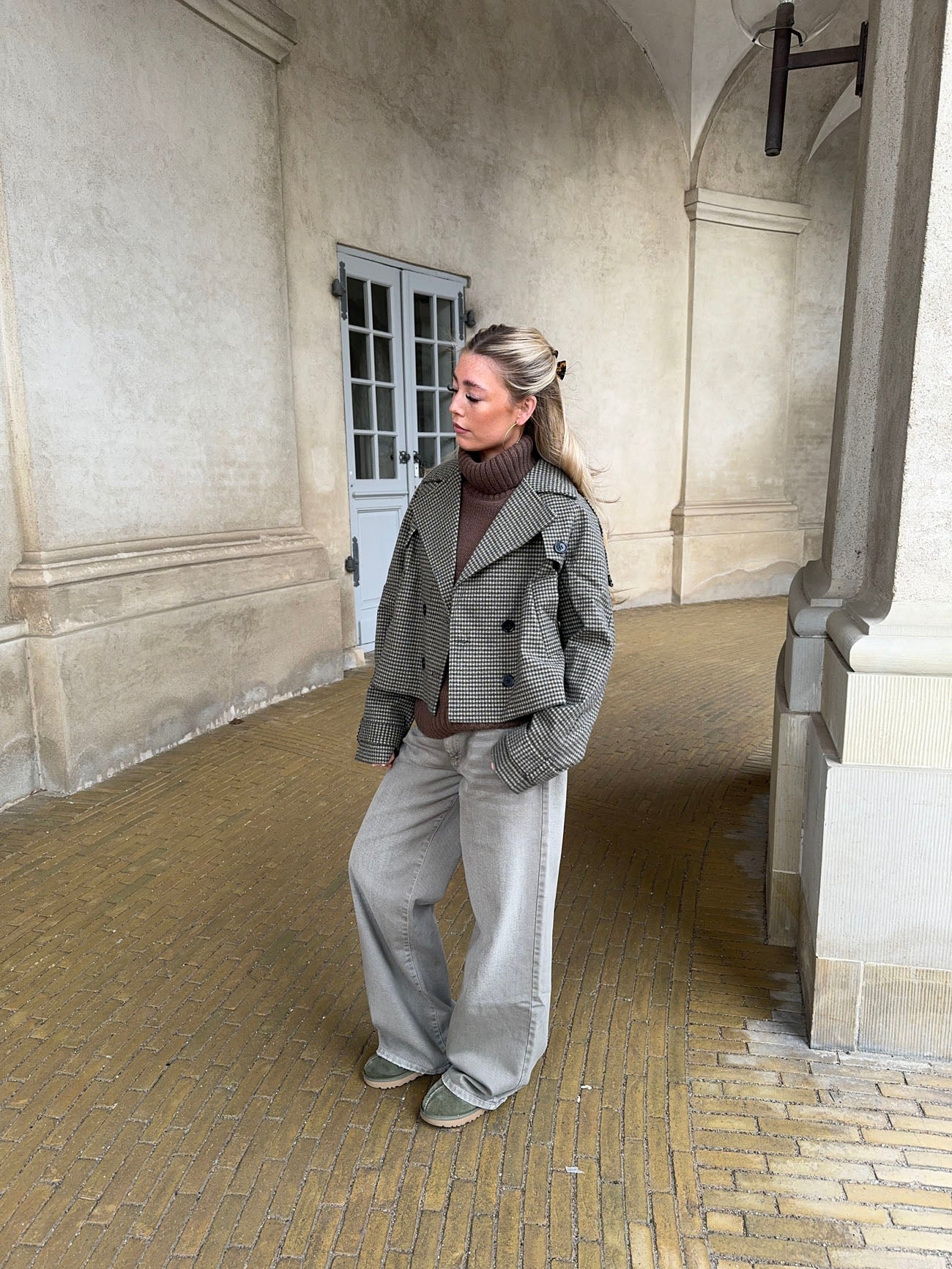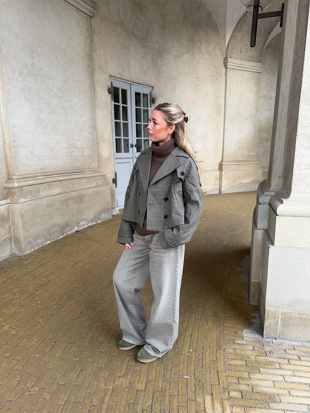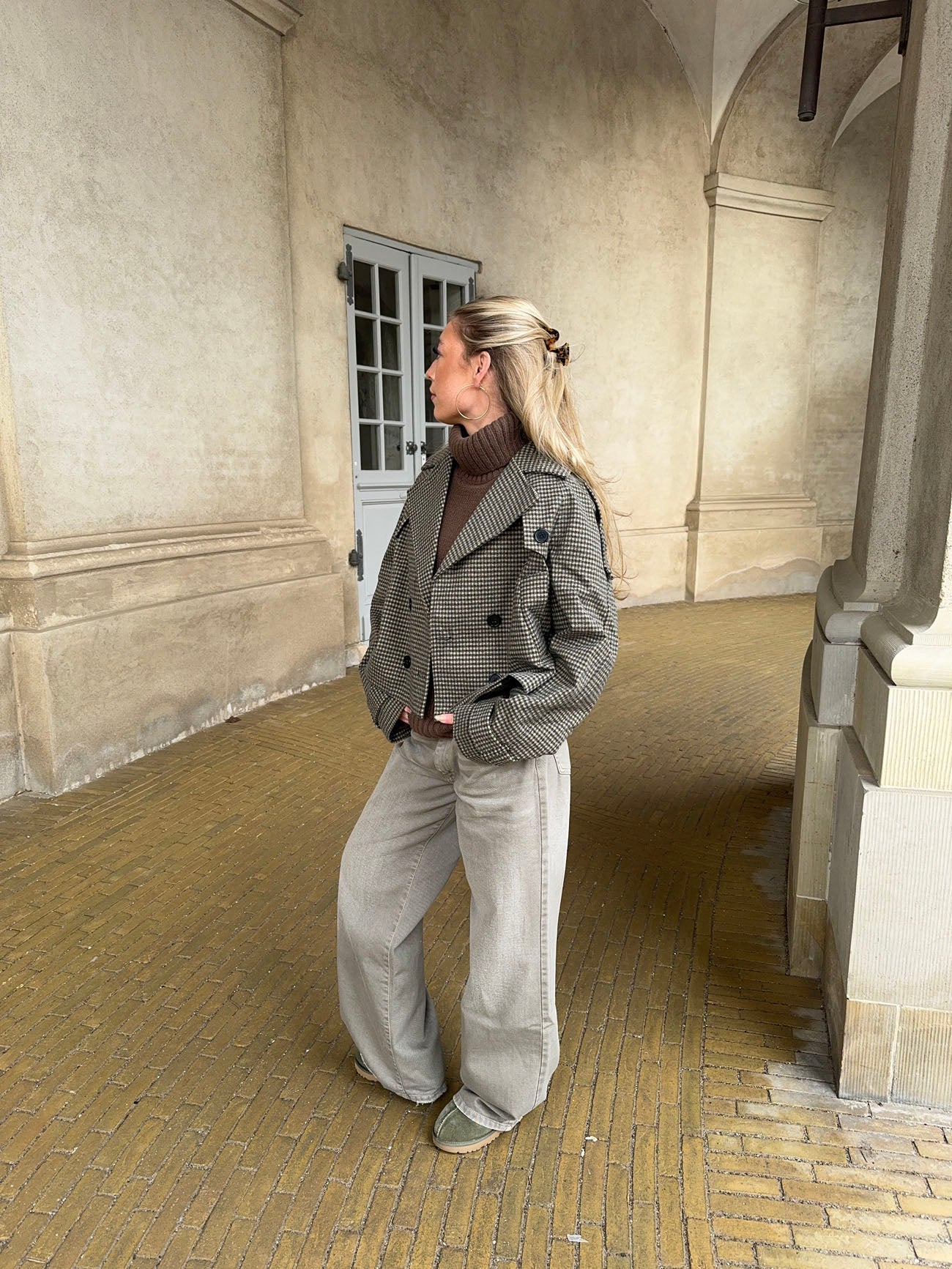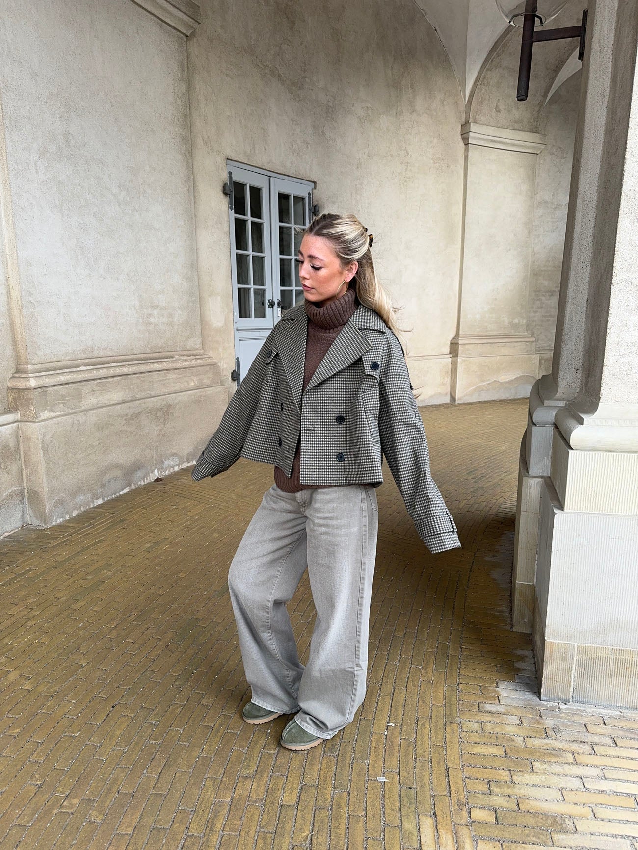This short coat is an elegant choice with a classic collar and button closure, creating a timeless look. The checkered pattern gives the coat a sophisticated and eye-catching design, while the subtle details on the shoulders and cuffs add a modern edge. Practical pockets enhance both functionality and style. Perfect for completing a professional and sleek autumn or winter outfit.